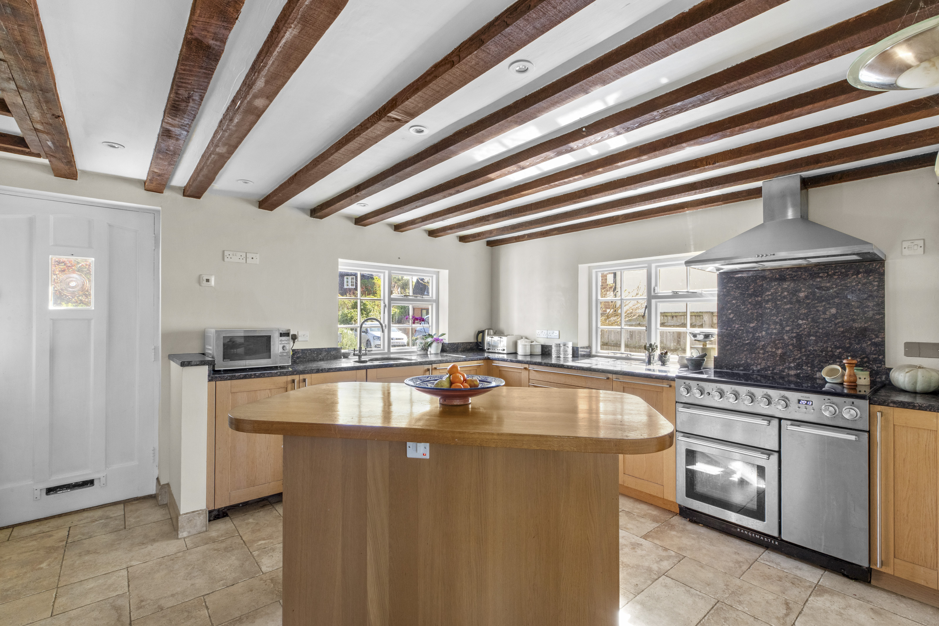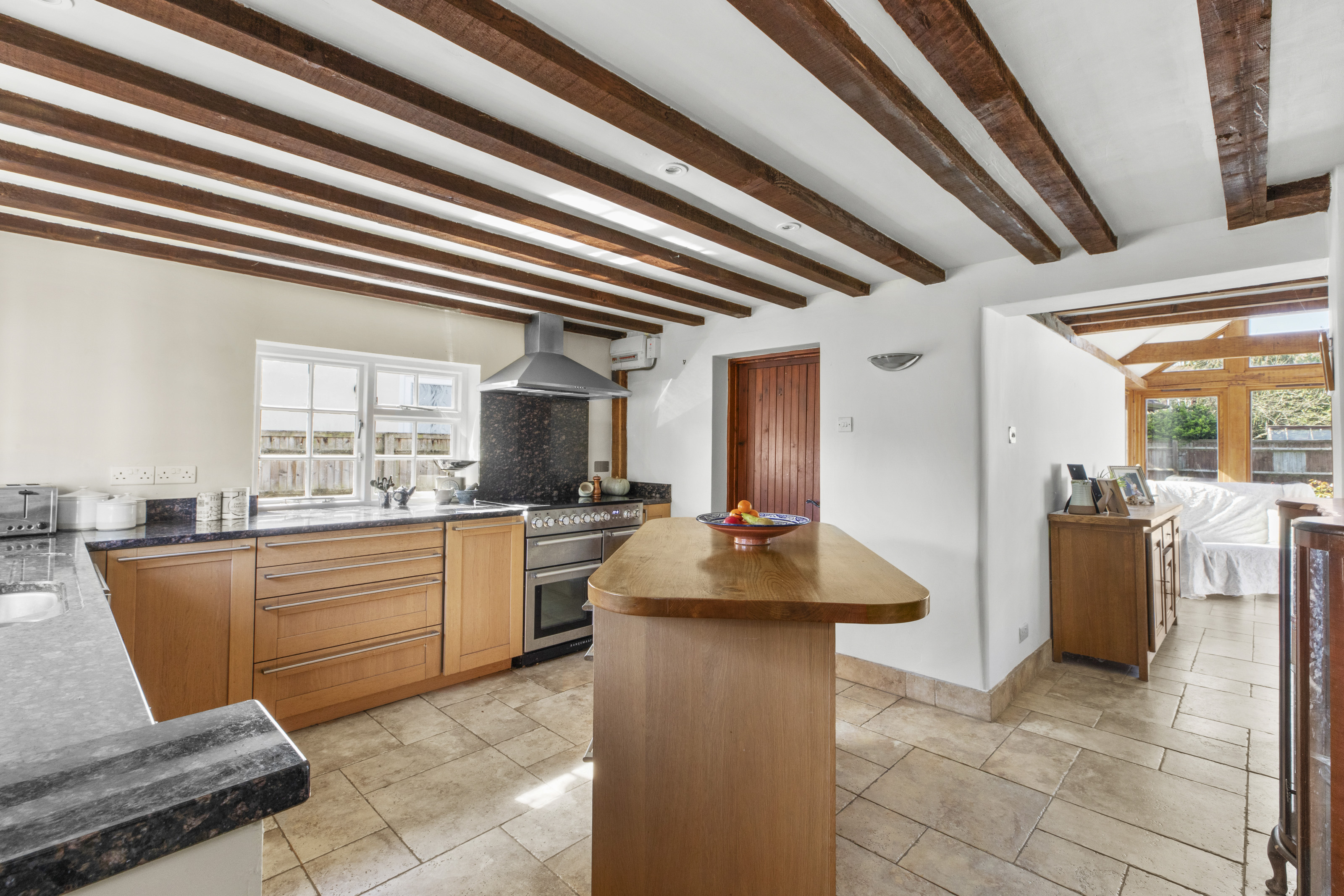 - THE BEAUTIFULY APPOINTED SHAKER KITCHEN WITH ISLAND, PERFECT TO ENJOY A COFFEE WITH FRIENDS FLOWS INTO THE VAULTED OAK FRAMED DINING SPACE WITH DOUBLE DOORS INTO THE REAR GARDEN