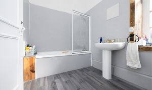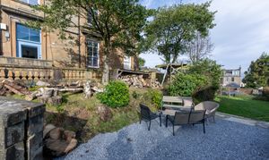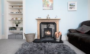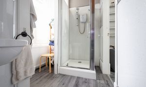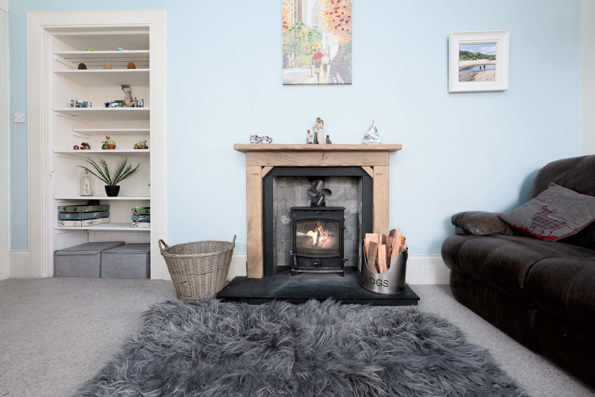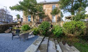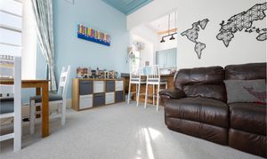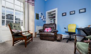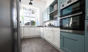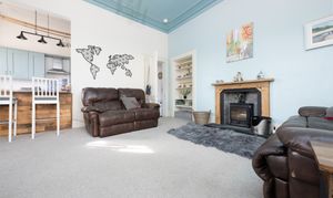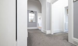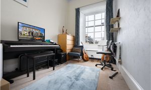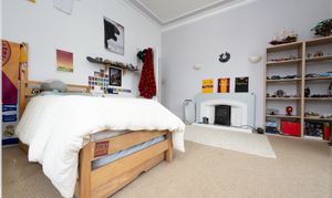 The stunning living space effortlessly combines period charm with contemporary comfort. The high ceilings, ornate cornicing, and large windows create a bright and airy feel, while the soft blue tones add a sense of tranquillity. A striking wood-burning stove, framed by a natural timber mantel, serves as the heart of the room, offering a cosy focal point for relaxation. The open-plan layout seamlessly connects the living area to the beautifully designed kitchen, featuring a stylish breakfast bar with rustic wood panelling, perfect for casual dining or entertaining. Built-in shelving adds both character and practicality, making this an inviting and functional space for modern living.A private entrance leads into a welcoming hallway, setting the tone for the grandeur that follows. The expansive lounge is a true showstopper, framed by magnificent sash windows that flood the space with natural light. High ceilings, intricate cornicing, and an original fireplace further elevate the room’s refined yet cosy atmosphere. The beautifully appointed dining kitchen is designed with both style and practicality in mind, featuring sleek cabinetry, ample workspace, modern appliances, and generous space for entertaining or family gatherings.