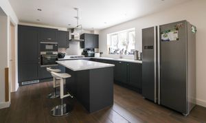 Upon entering, you’re welcomed by a generous entrance hallway. To the right, a spacious lounge, with a walk-in box bay window, provides a bright and comfortable retreat, ideal for relaxing or entertaining guests. To the rear of the home, the stunning open-plan kitchen/dining area spans the full width of the property. This stylish kitchen is fitted with a sleek range of high quality wall and base units, integrated 'AEG' appliances, and a central island that acts as a real focal point, perfect for both casual dining and social occasions. The adjoining dining and family space is flooded with natural light and features bi-fold doors that open onto a charming pergola covered patio, seamlessly blending indoor and outdoor living. A practical utility room leads off the kitchen, providing additional storage and access to the side garden. To complete this floor, there is a useful downstairs cloakroom, conveniently located off the hallway.