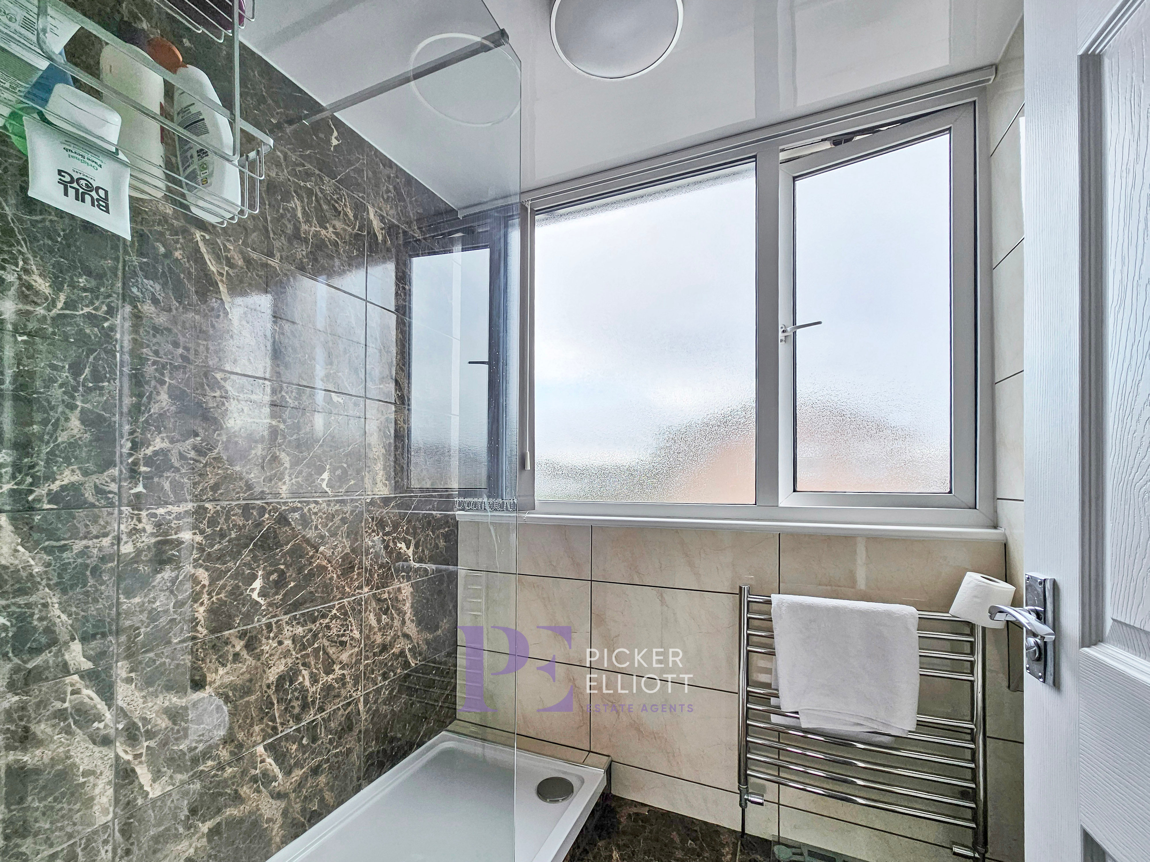 With low level flush WC, vanity sink unit, bath with glass shower screen, electric shower over, tiling to surrounding four walls and flooring, chrome towel radiator, electric shaver point, opaque double glazed window and extractor fan.