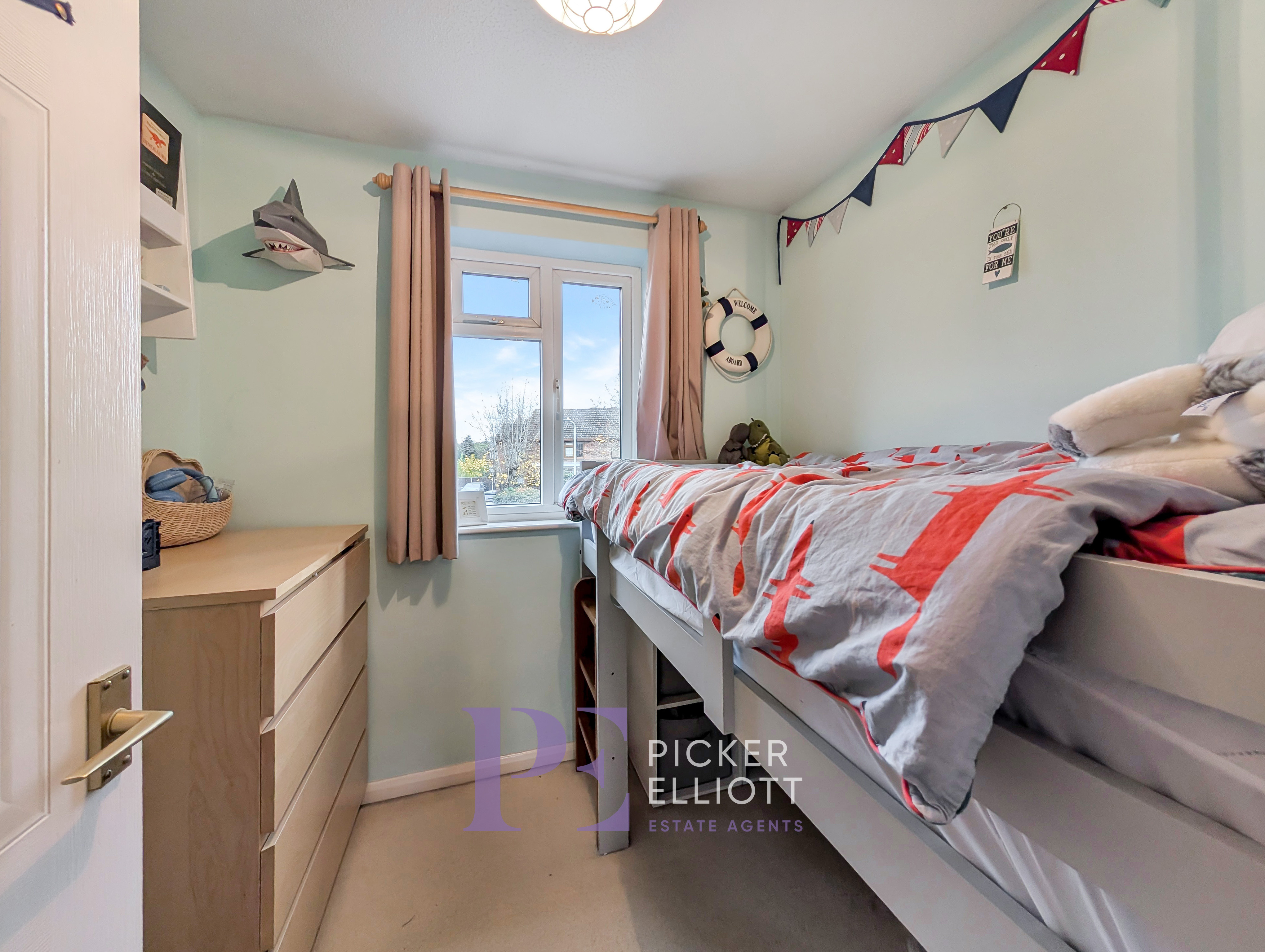 Upstairs, the principal bedroom is a restful retreat at the rear of the house, featuring stylish panelling and built-in wardrobes for ample storage. There is another comfortable double bedroom to the front, alongside a versatile third bedroom ideal for a nursery or study. The fresh, modern bathroom is fully tiled and equipped with a three-piece suite, including a shower over the bath.