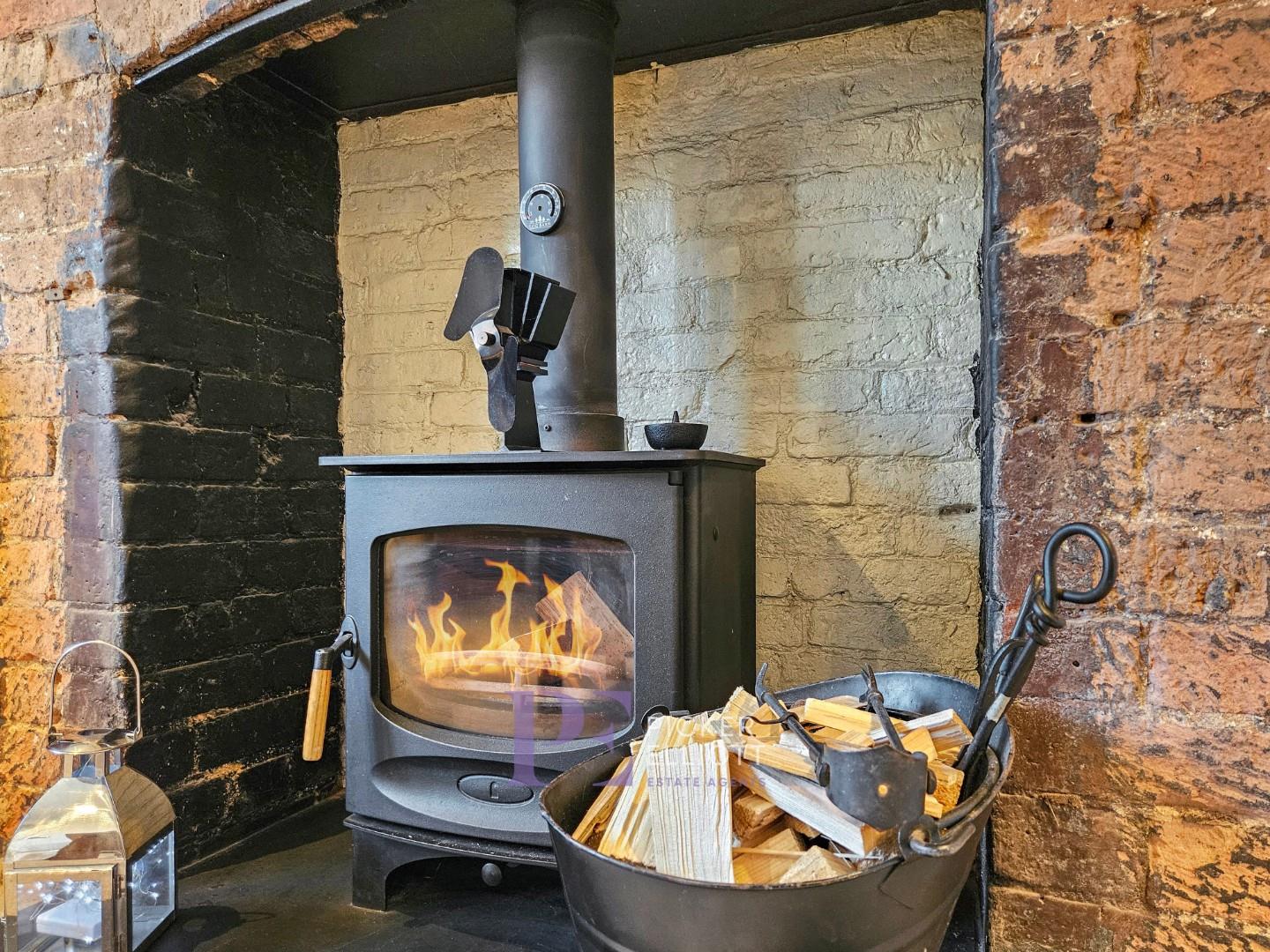 With log burning stove, tiled hearth, exposed brick work surround, double glazed window, inset spot lights, double radiator, door to useful understairs storage, and exposed wooden beam.