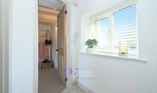 With double glazed window, vaulted ceiling with exposed beams, double radiator, two storage cupboards, one with radiator, double glazed window doors to stairs.