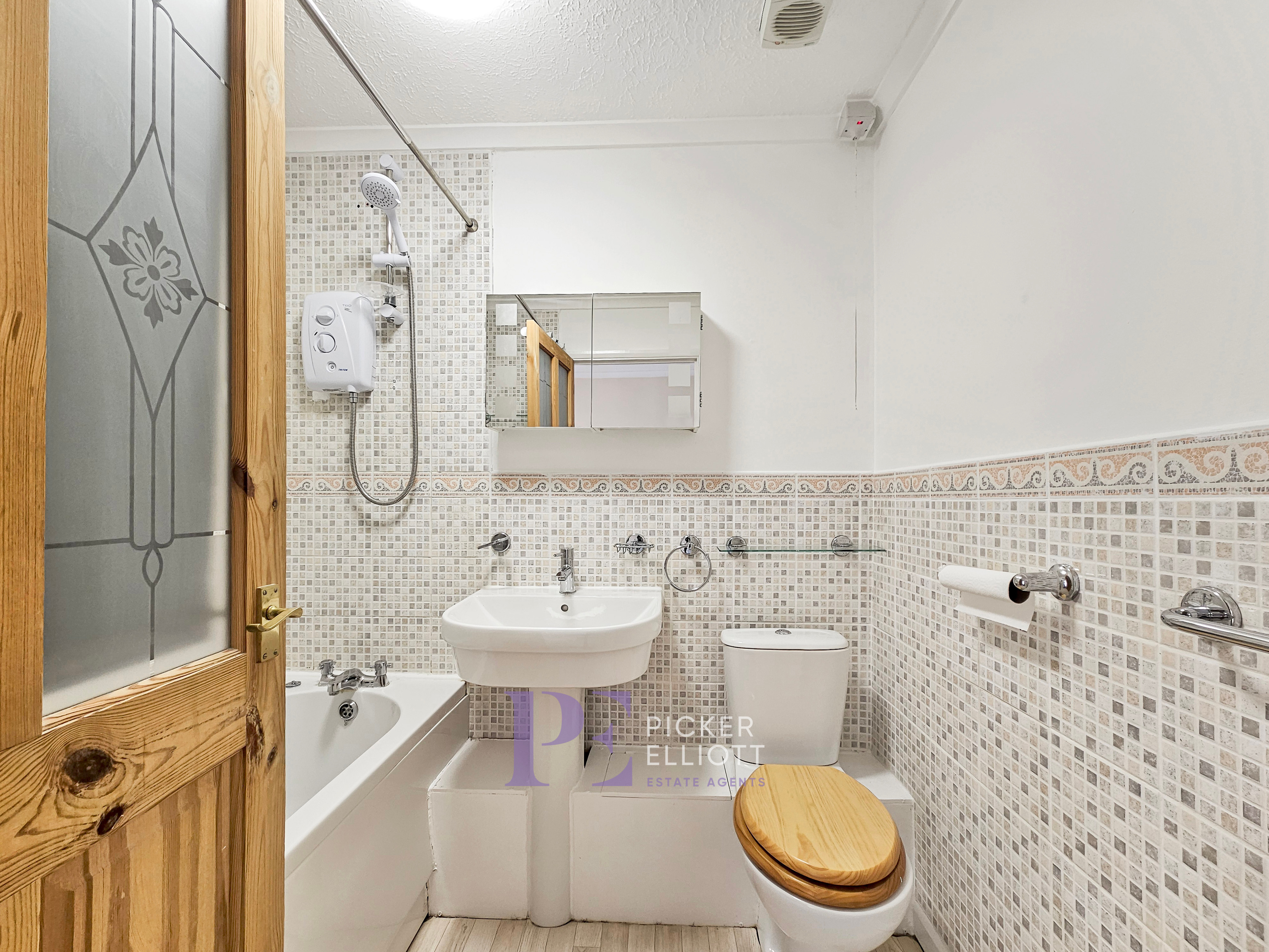 Low level flush w.c, pedestal wash basin, panelled bath with electric shower over, tiled to splashback areas, radiator and extractor fan