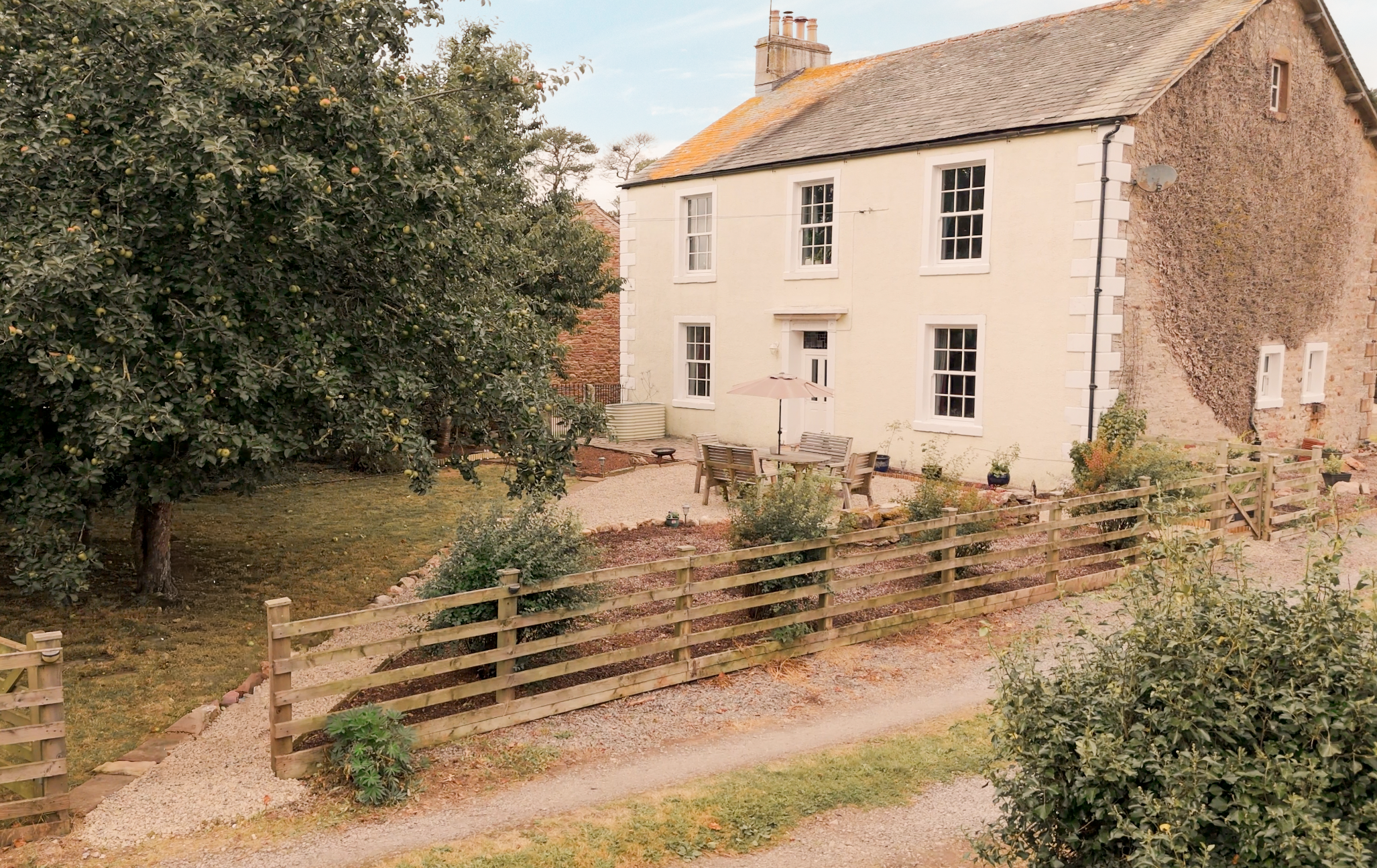 The house sits behind a gated gravelled approach with parking and turning space. A patio terrace at the front provides an inviting spot for al fresco dining, framed by lawns, several trees including an established Bramley apple tree.