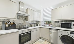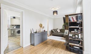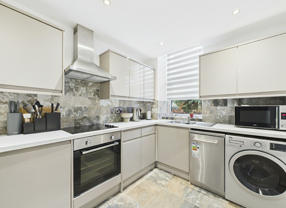 The property features a bright and welcoming lounge/dining room with Juliet balcony, allowing natural light to flood the space, while the contemporary kitchen is finished to a high standard with mushroom-coloured high-gloss wall and base units, integrated cooking appliances and feature splashback tiling.