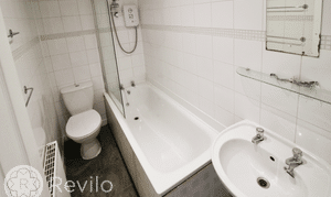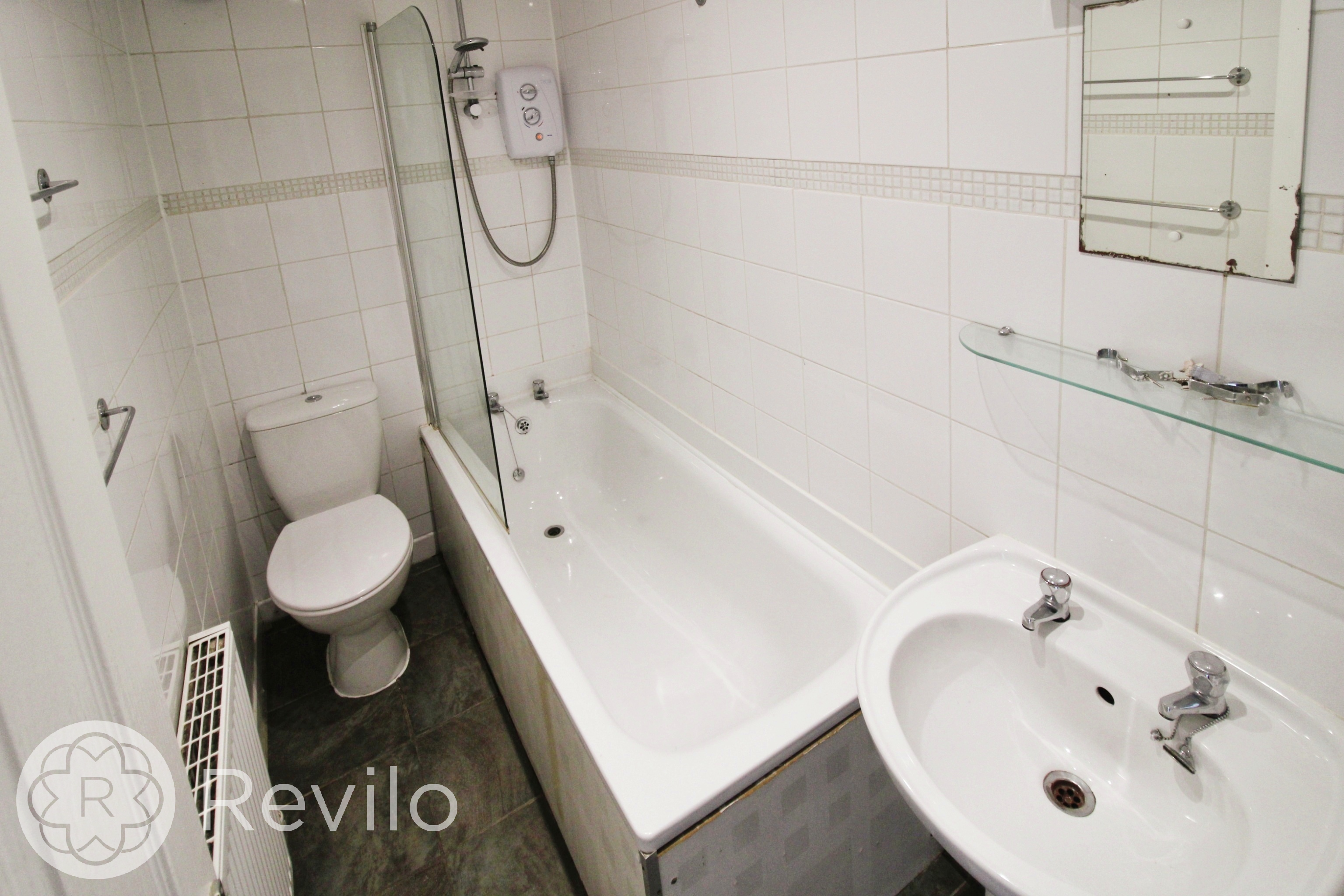 Expel air, radiator, ceiling spot lights, three piece suite in white comprising of WC, pedestal sink and panel bath, electric shower and screen, tiled walls & floor.