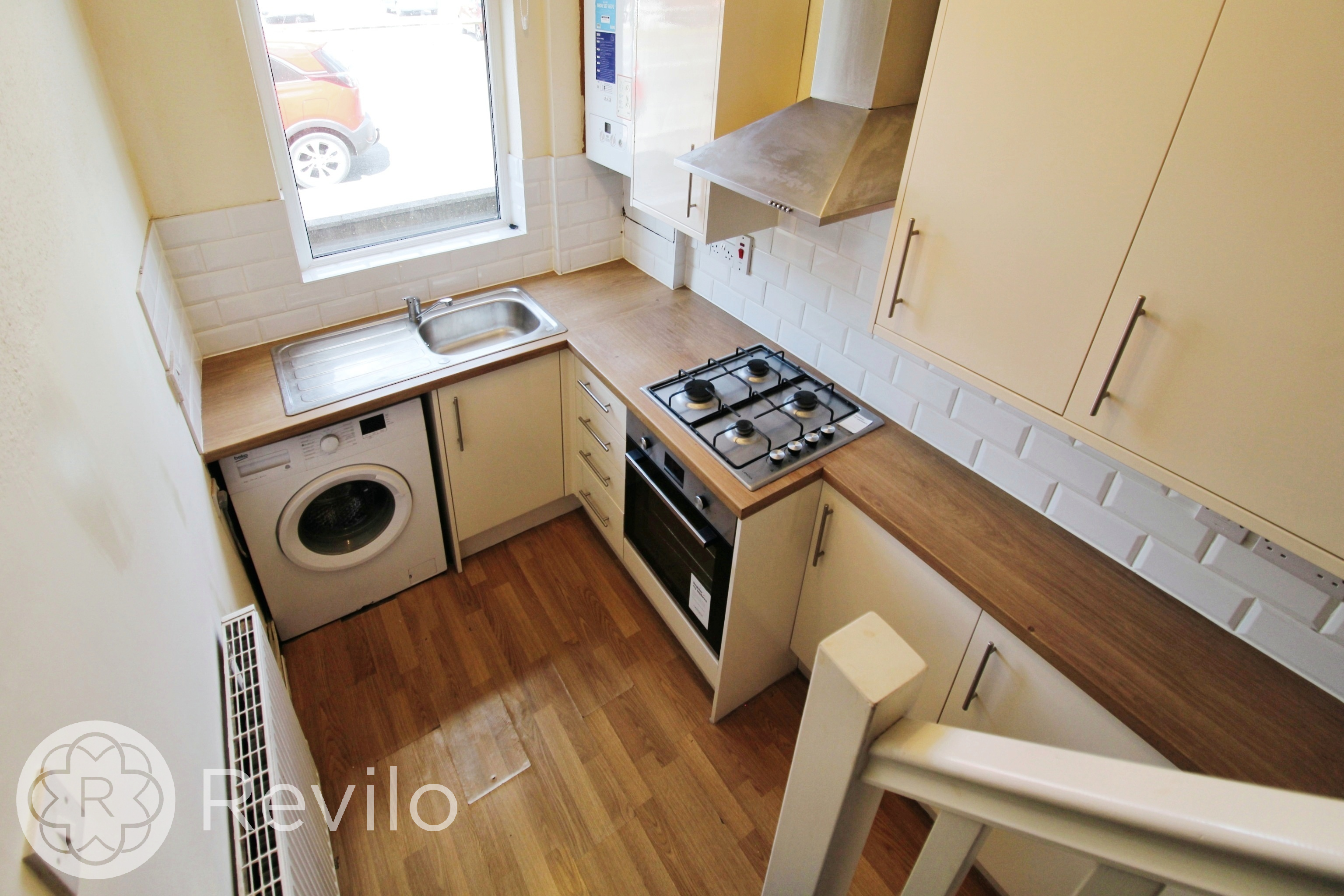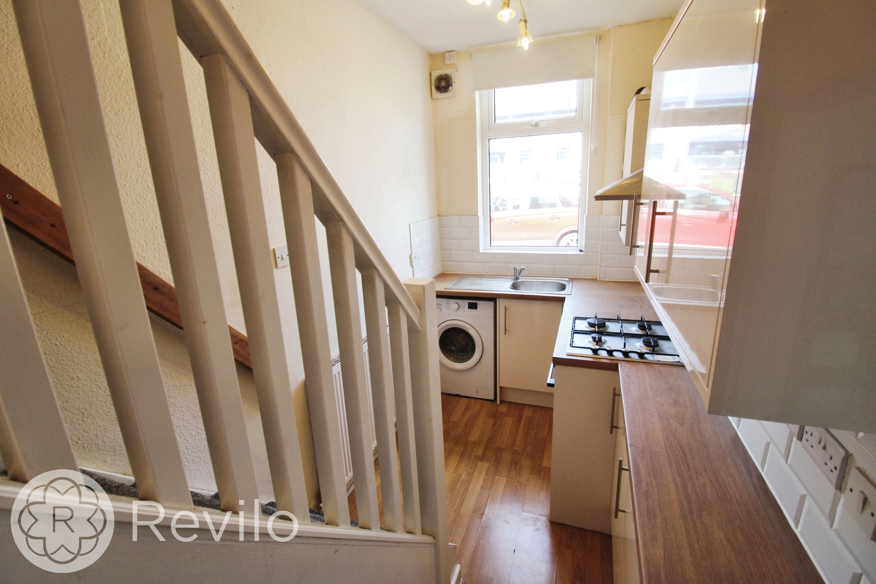 Front facing double glazed window, radiator, neutral décor, modern kitchen fitted Feb 2019, good selection of wall and base units, complimentary work surfaces, splash back tiling, sink & drainer, gas hob, extractor and oven, plumbed for automatic washing machine, wall mounted boiler, wood effect laminate flooring, under stair storage, staircase leading to the first floor.