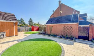 Externally, the home is a gardener’s dream. To the front, a block-paved driveway offers parking for two vehicles alongside a lawned area with vibrant, well-tended flower borders, which continue around the large corner plot. A gated access leads through to the rear garden.