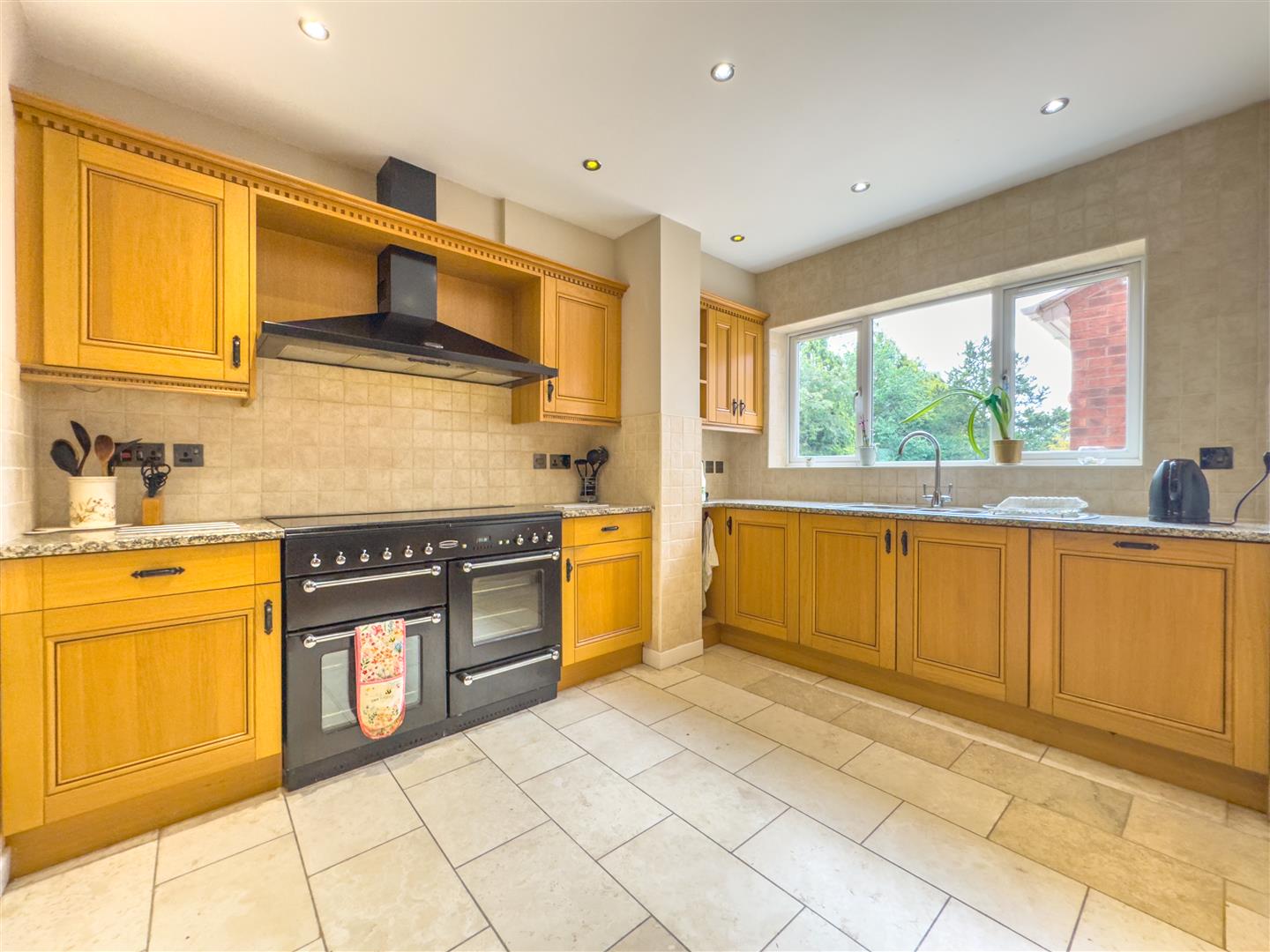 The central hallway leads into a functional breakfast kitchen and dining room. This area offers a range of units, an integrated dishwasher, a freestanding range cooker, an extractor fan, and extended worktops that provide convenient cooking and preparation space. There is also space for a dining table and access to the rear and west portion of the property.