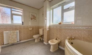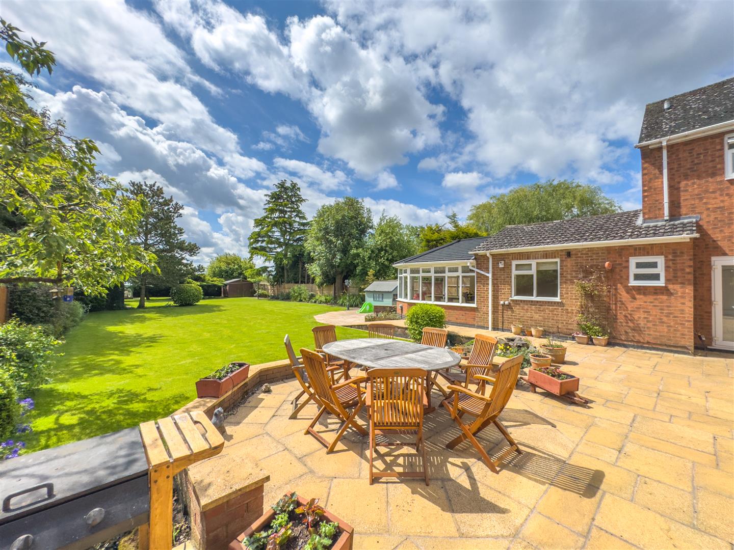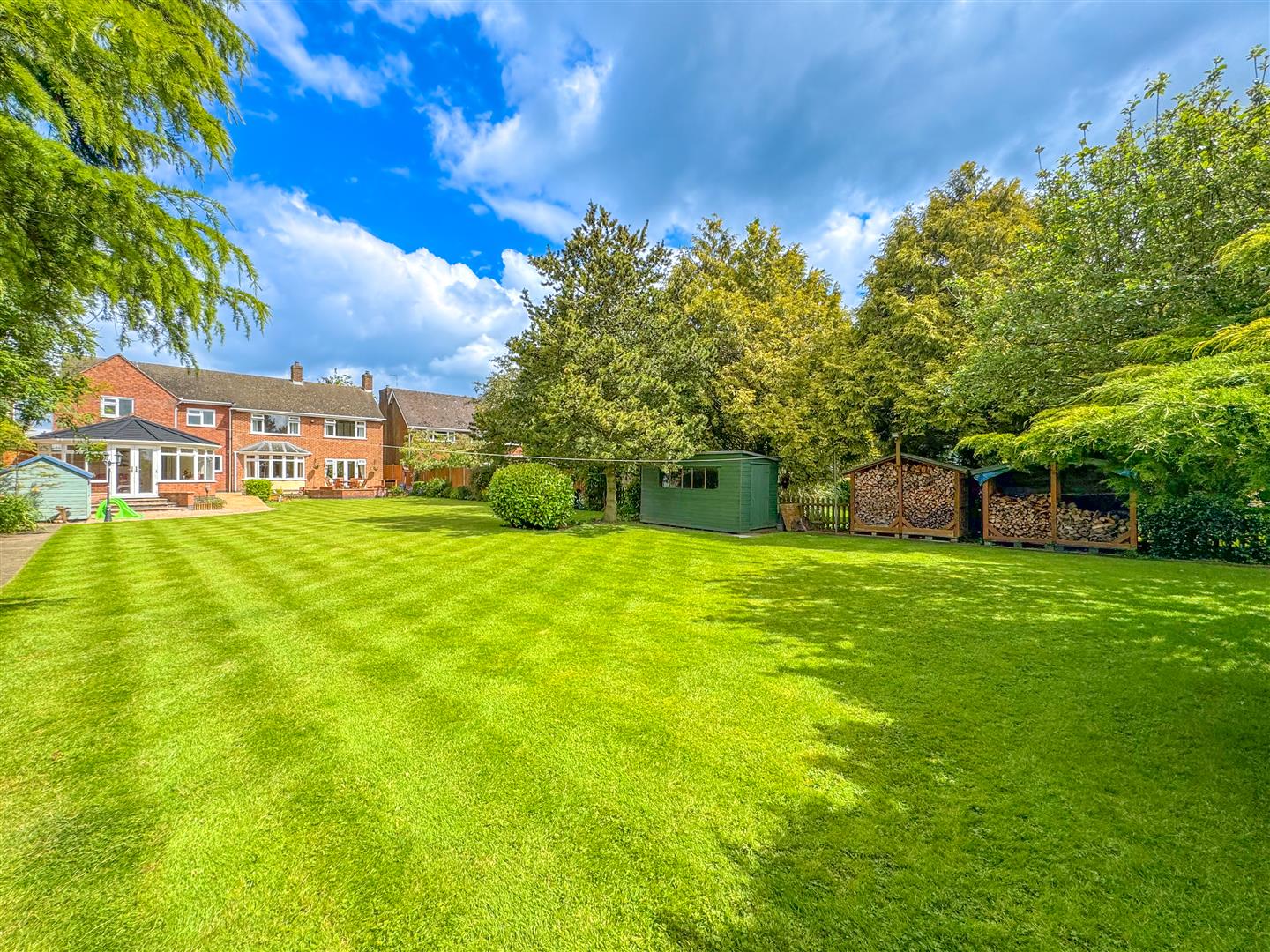 Externally, the front of the property features a large driveway consisting of a mixture of block paving and stone chippings, providing parking for multiple vehicles and access to a double garage. Access points on either side of the property lead to the rear gardens. The show stopping mature garden at the rear is lawned, with established shrubs and trees, well-stocked borders, and a paved patio area perfect for summer entertaining, offering an open outlook over the surrounding fields to the south.