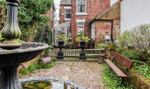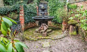 The bespoke breakfast kitchen is beautifully appointed with rich, walnut-style cabinetry, integrated appliances, and a striking centre island as its focal point. A wonderful Victorian conservatory extends from the kitchen—bathed in light and finished with matching tile flooring, it offers a peaceful retreat overlooking the private courtyard garden.