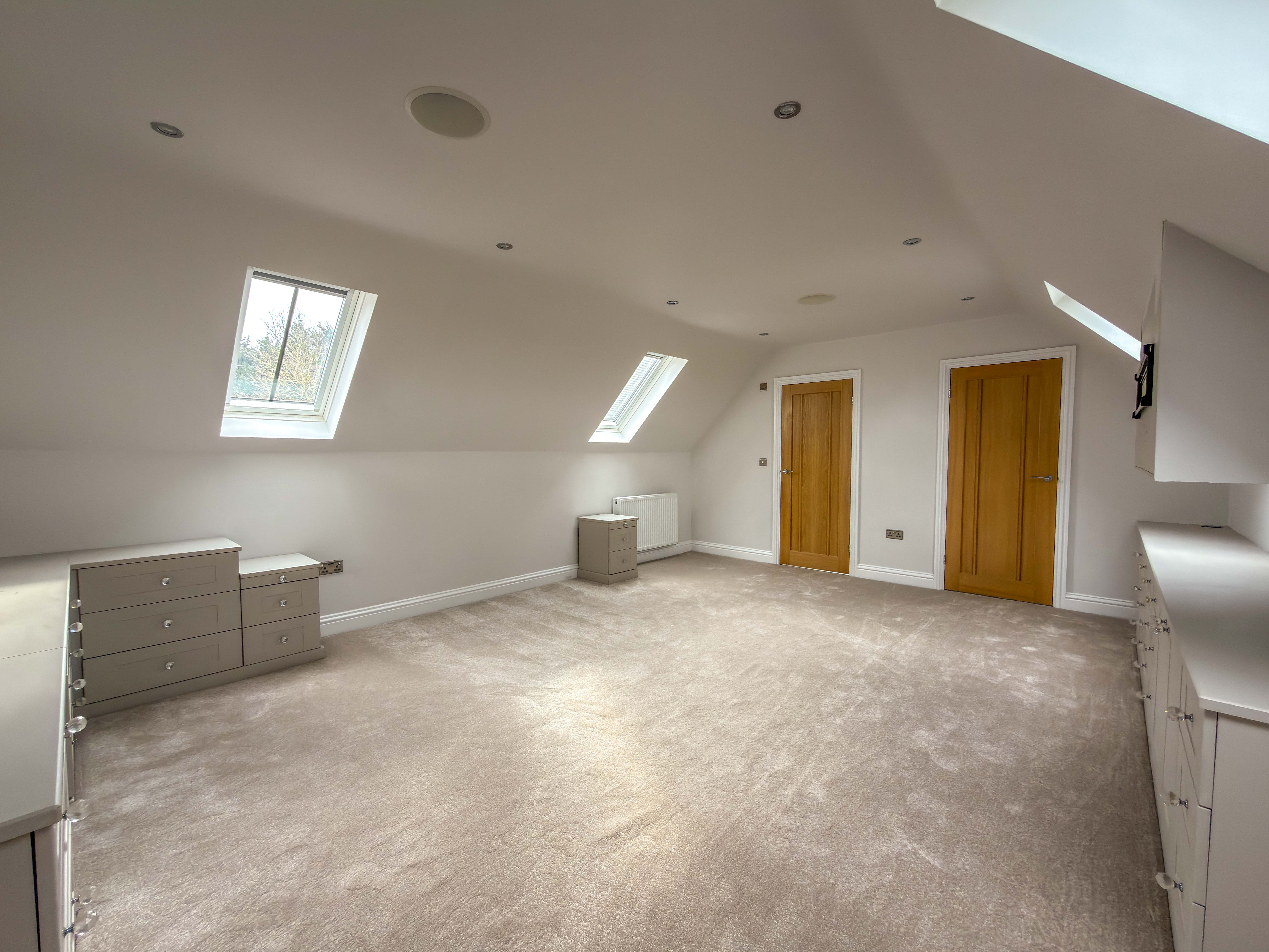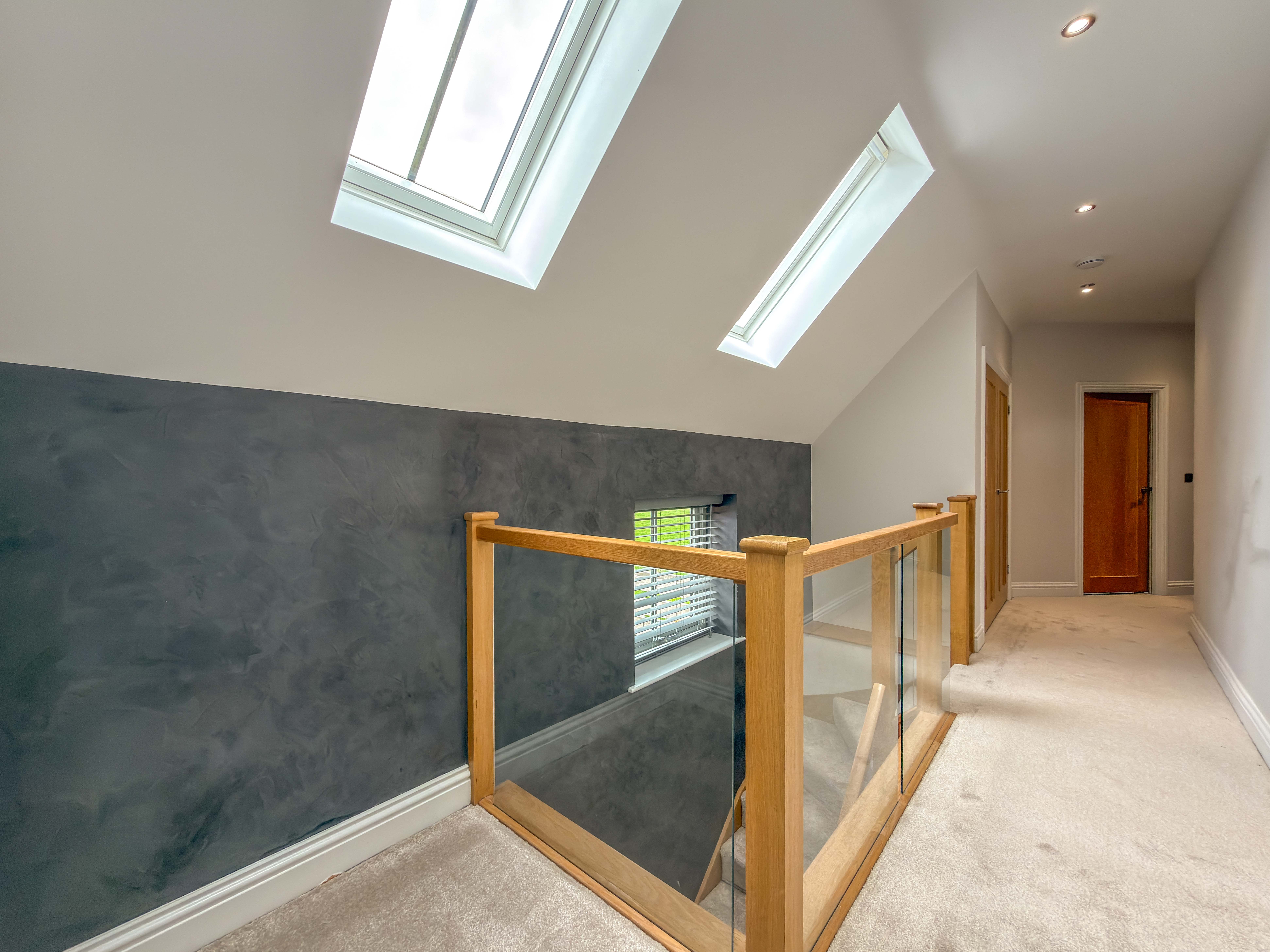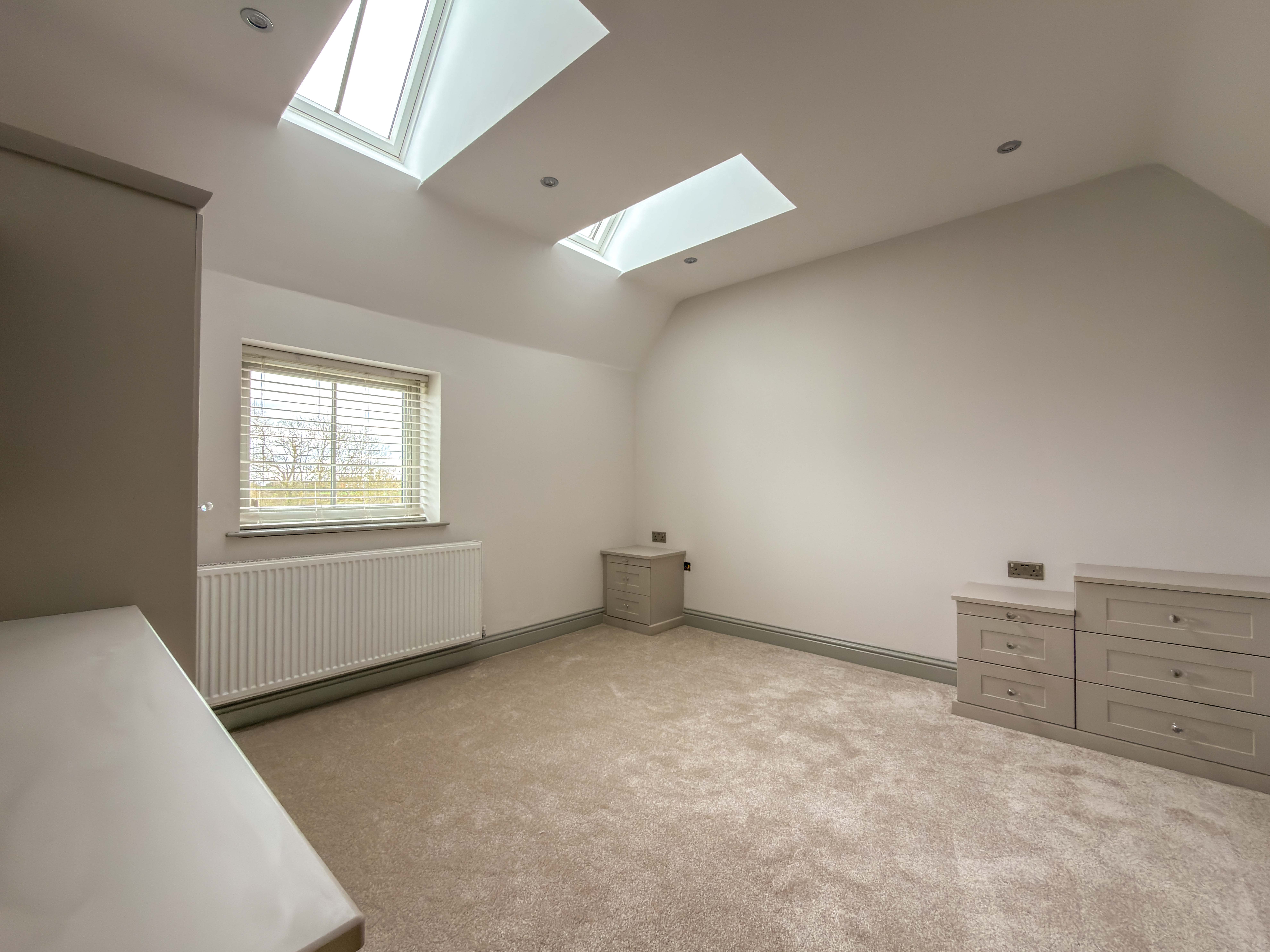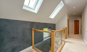 The first floor landing, with Velux skylights and storage, leads to four well-proportioned bedrooms, each bright and airy. The principal suite includes a walk-in wardrobe/dressing room and a beautifully designed en-suite bathroom with a double shower, bathtub and premium fittings. The third bedroom is fitted with custom wardrobes, drawers, and shelving. A high-spec family bathroom with a separate walk-in shower, modern bath with a inset television screen adds to the refined living experience.