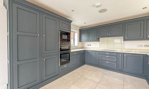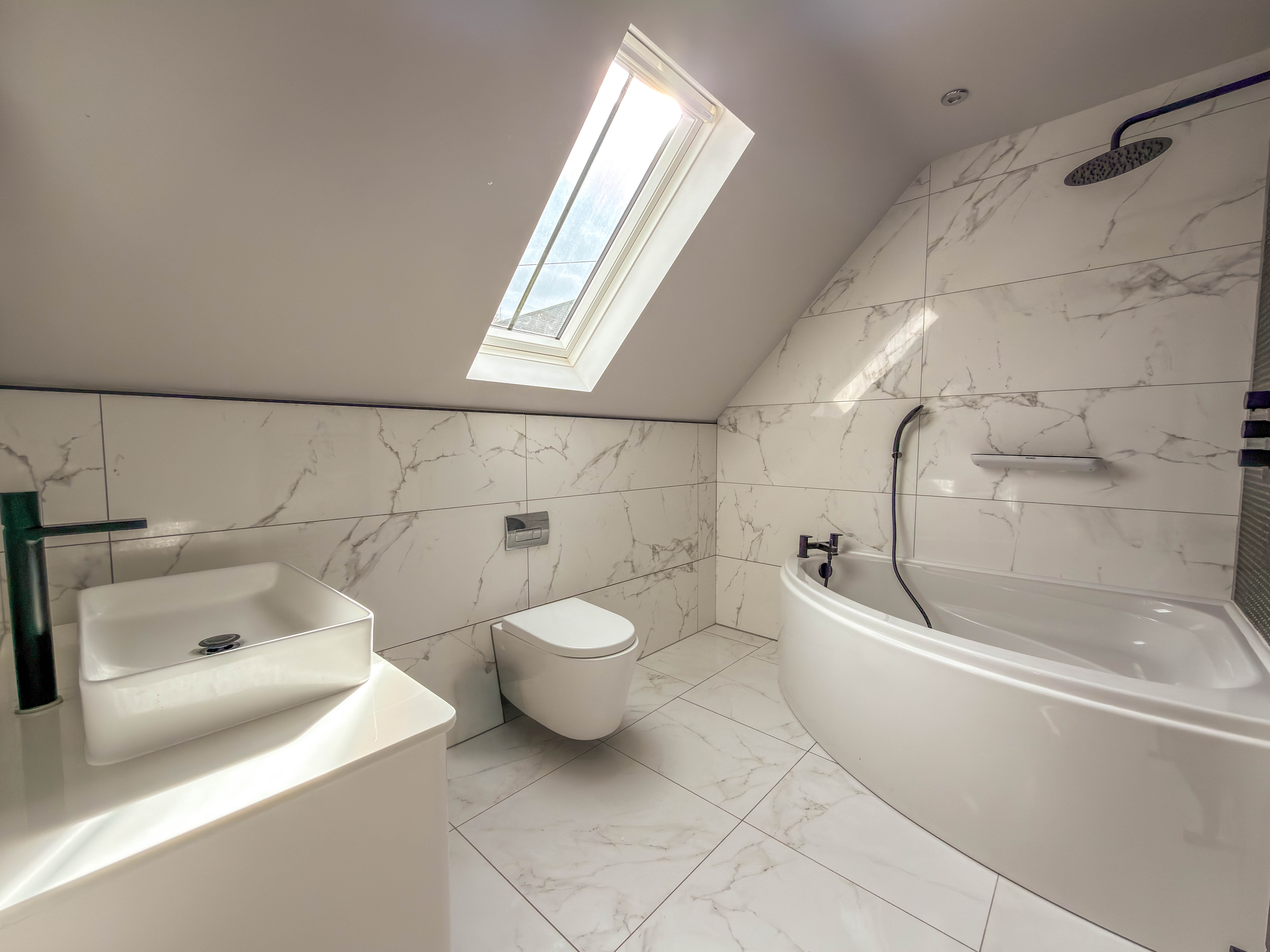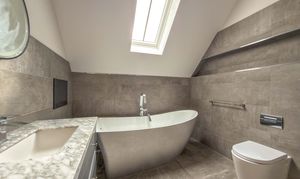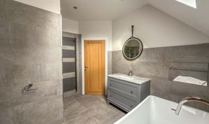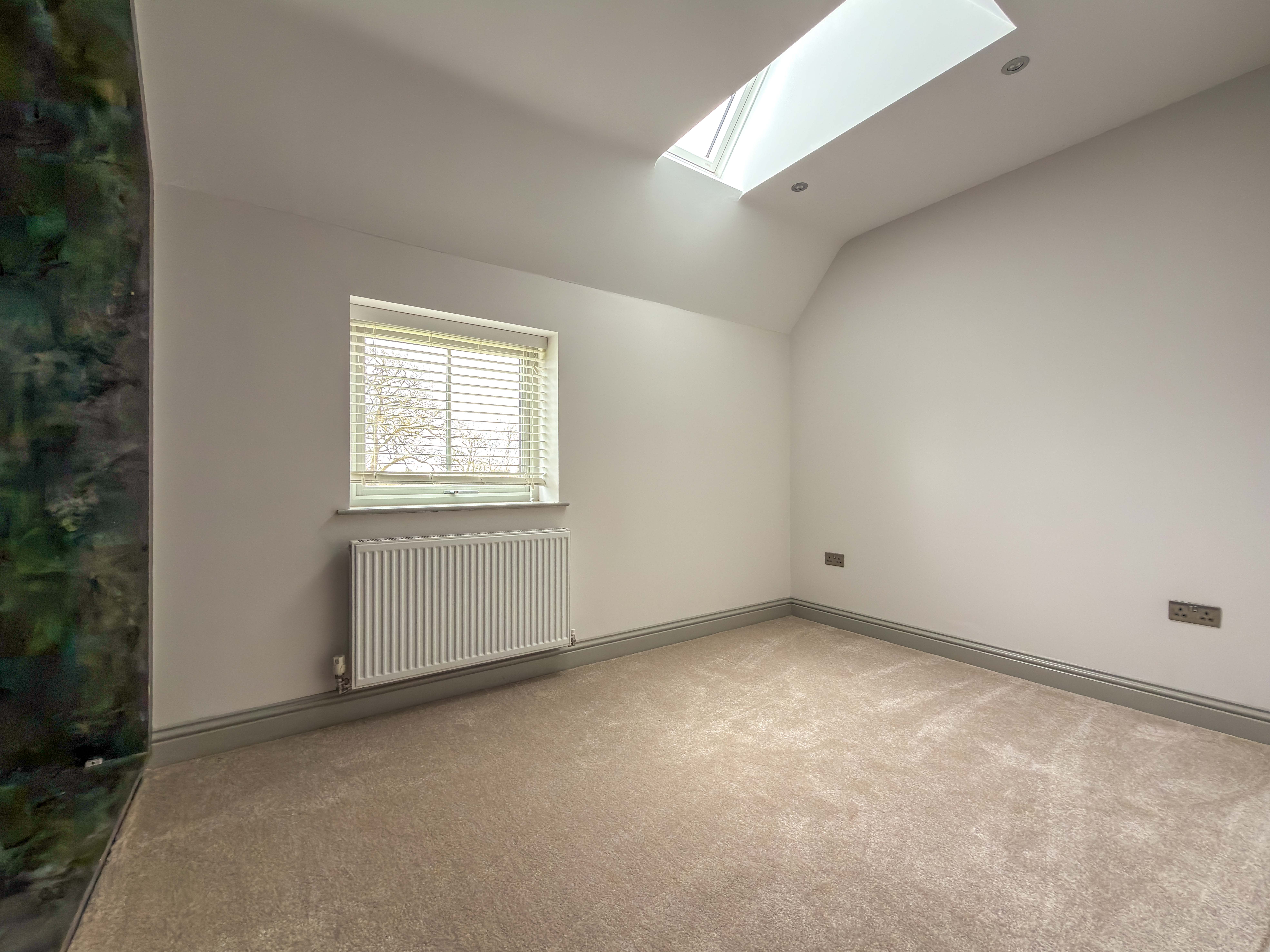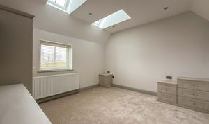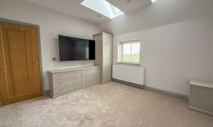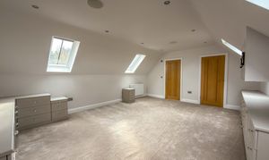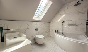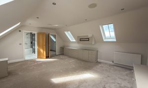 The first floor landing, with Velux skylights and storage, leads to four well-proportioned bedrooms, each bright and airy. The principal suite includes a walk-in wardrobe/dressing room and a beautifully designed en-suite bathroom with a double shower, bathtub and premium fittings. The third bedroom is fitted with custom wardrobes, drawers, and shelving. A high-spec family bathroom with a separate walk-in shower, modern bath with a inset television screen adds to the refined living experience.