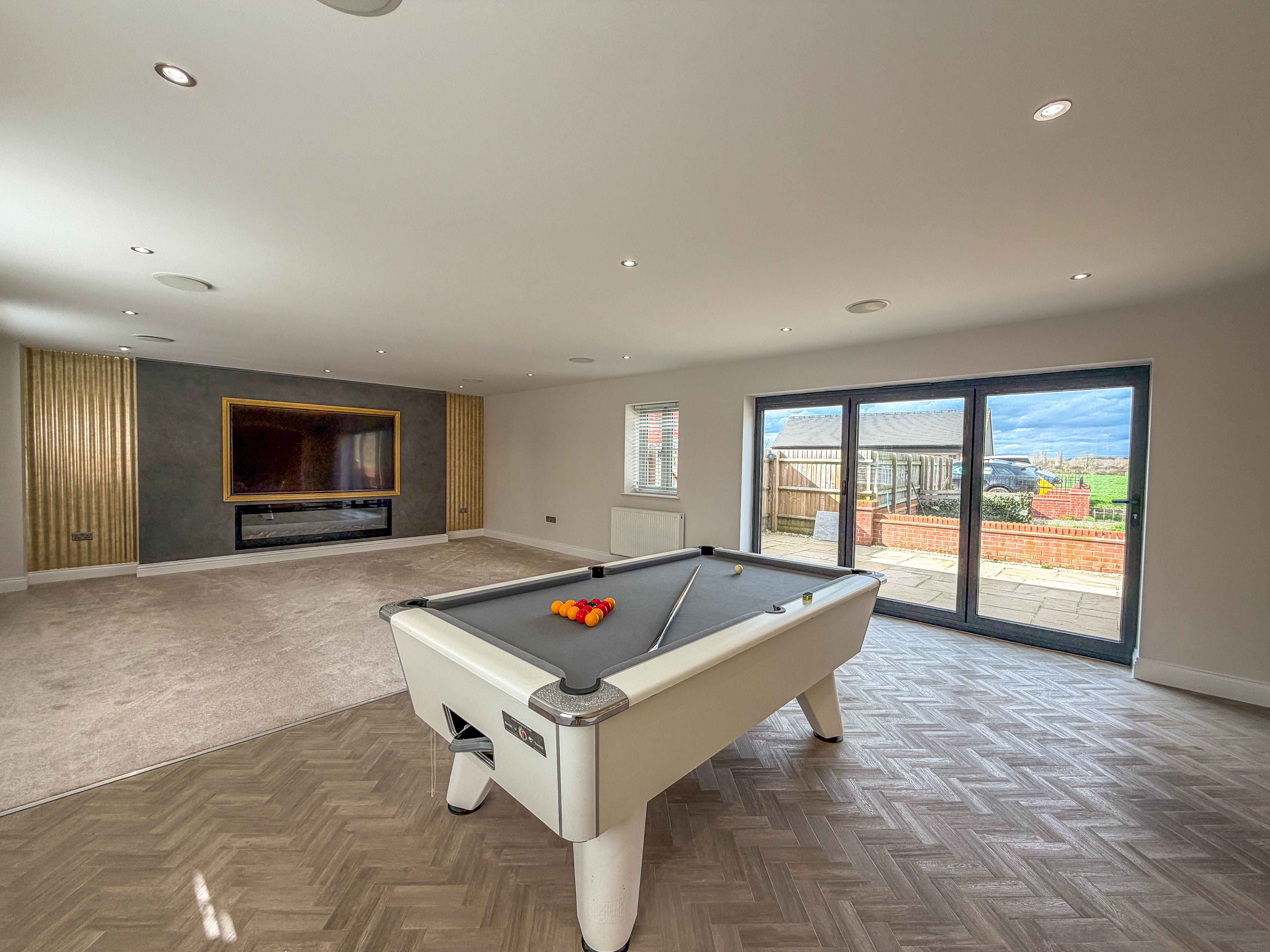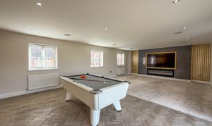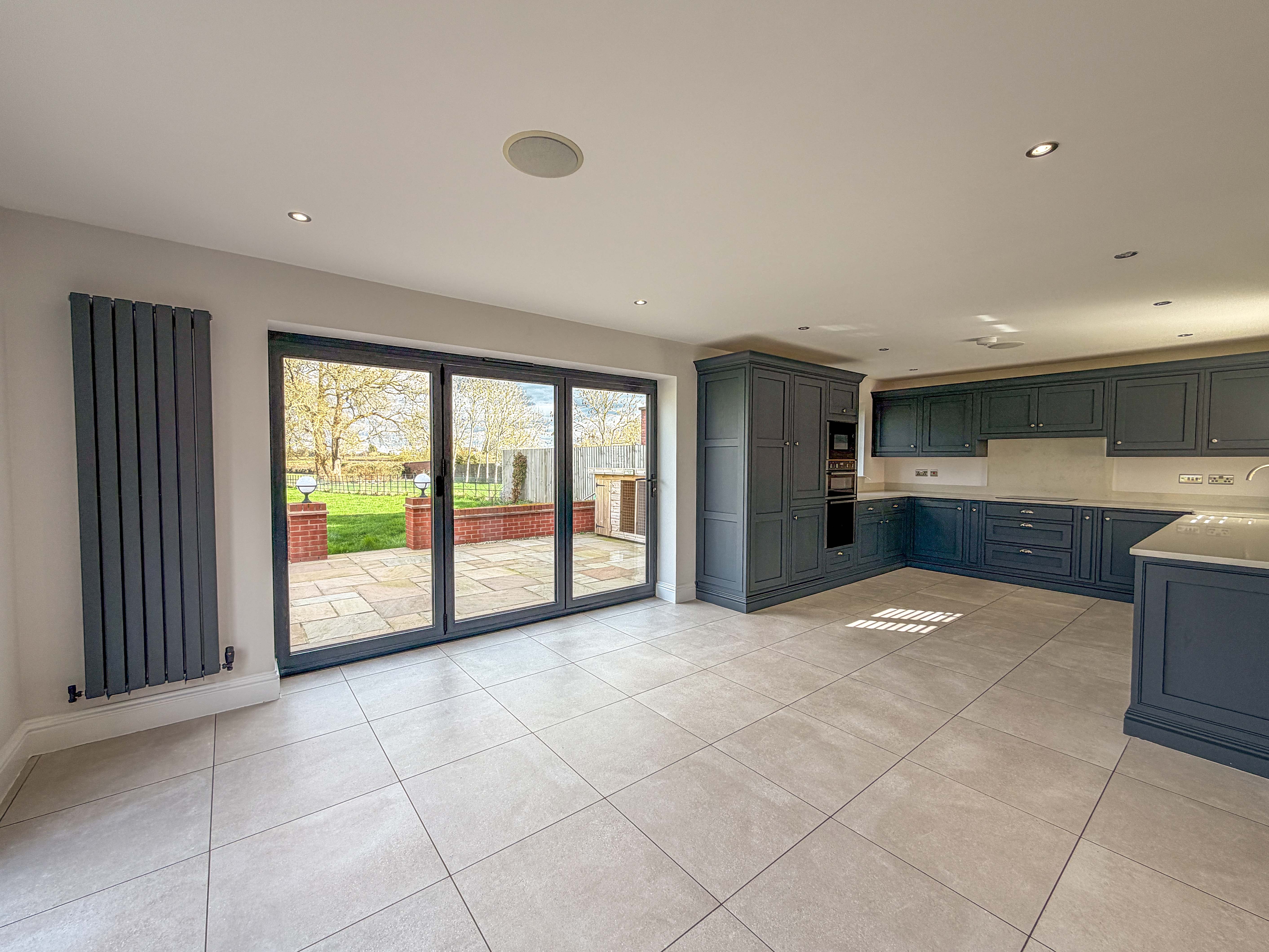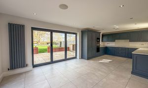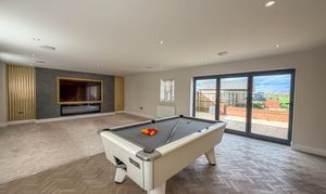 Finished to the highest standards throughout, the home begins with an elegant entrance hallway featuring an oak staircase, leading to a spacious and versatile layout. The impressive lounge/dining room boasts bi-fold doors opening onto a generous patio area, seamlessly blending indoor and outdoor living with a high specification feature media wall. The show stopping open-plan kitchen/family room is the true heart of the home – fitted with a range of bespoke high-quality units, granite worktops, and integrated appliances, with two sets of bi-folding doors flooding the space with light and providing uninterrupted views of the grounds.
