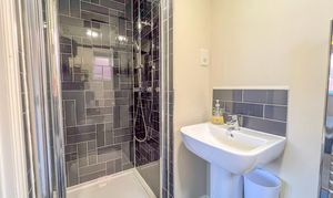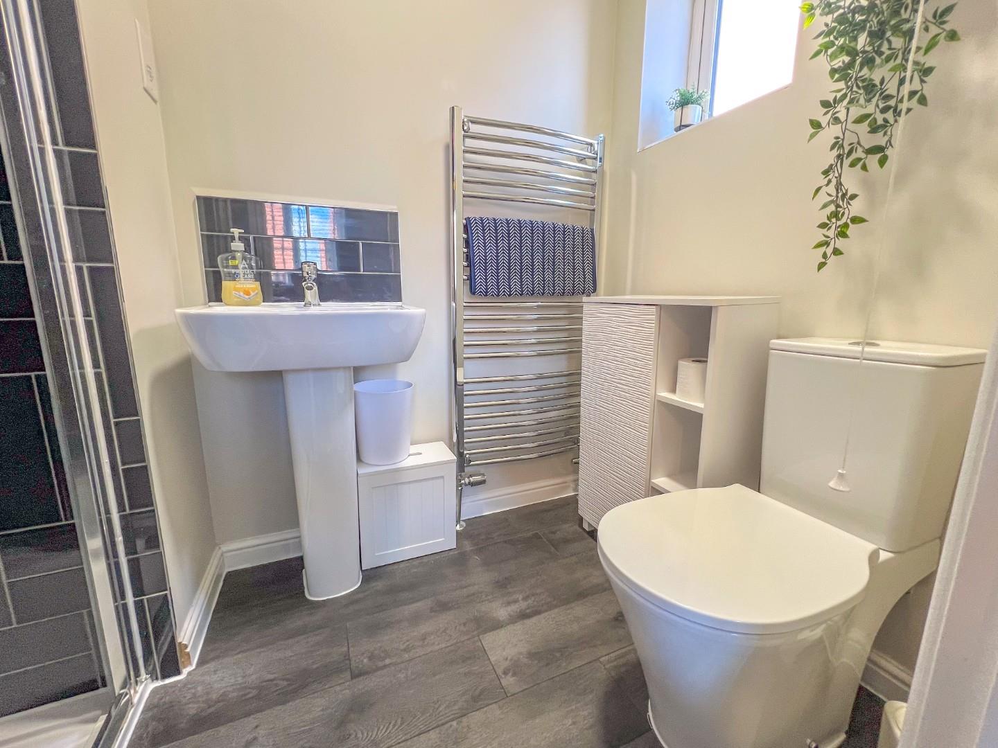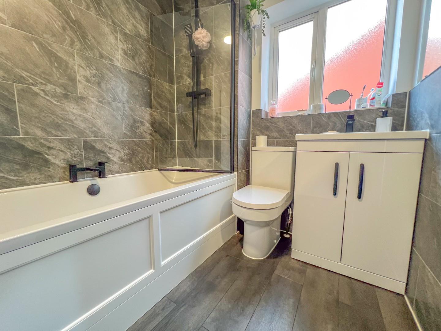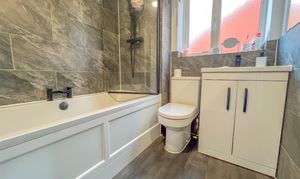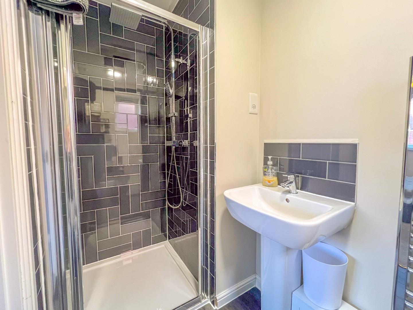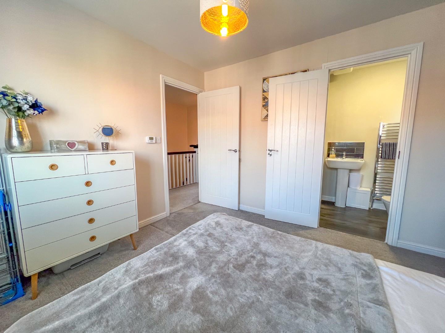 Upstairs, the main bedroom is a luxurious haven, complete with a modern en-suite shower room. Two further well proportioned bedrooms offer versatile living options, whether for family members, guests or a home office. A beautifully finished family bathroom, featuring a high end suite and tasteful tiling, completes this level with sophistication.