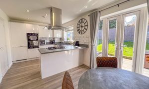 The heart of the home is the stunning open-plan kitchen and dining area, fitted with a sleek range of contemporary units, contrasting work surfaces, and high-quality appliances. This stylish and functional space is ideal for both everyday living and entertaining, enhanced by double French doors that open onto the rear patio, creating a seamless flow between indoor and outdoor spaces—perfect for summer gatherings.