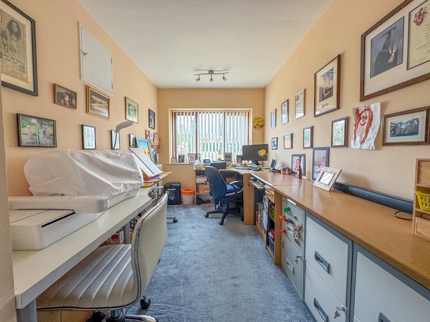 The well-appointed L-shaped kitchen is designed for both practicality and style, featuring a range of sleek cream gloss units and a central island providing ample workspace. A gas cooker point and an extended utility area with plumbing for a washing machine add to the convenience, while French doors lead out to the garden, enhancing the indoor-outdoor flow. Additionally, a versatile family room/home office at the front of the property offers endless possibilities to suit individual needs.