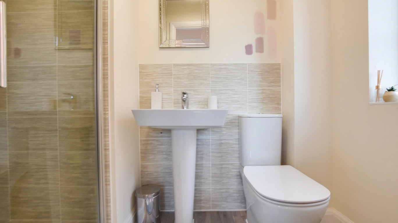 With a double-glazed window, a shower cubicle with a shower over, sink, WC, heated towel radiator.