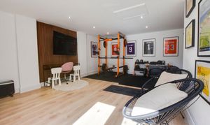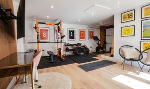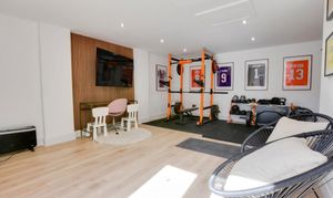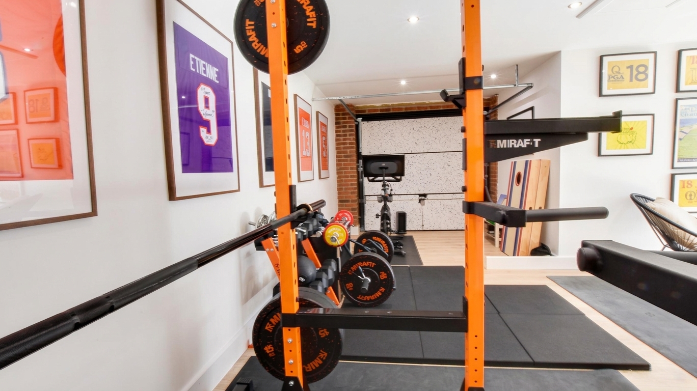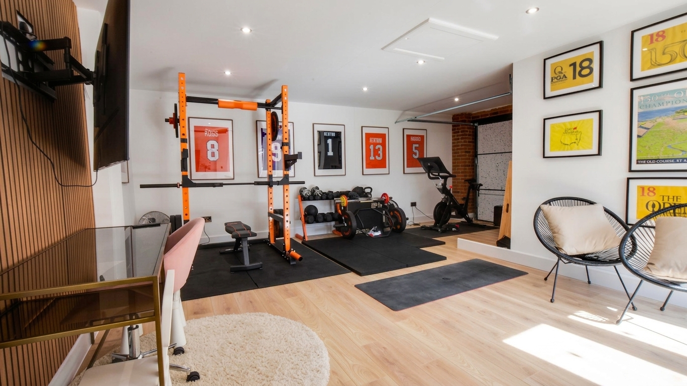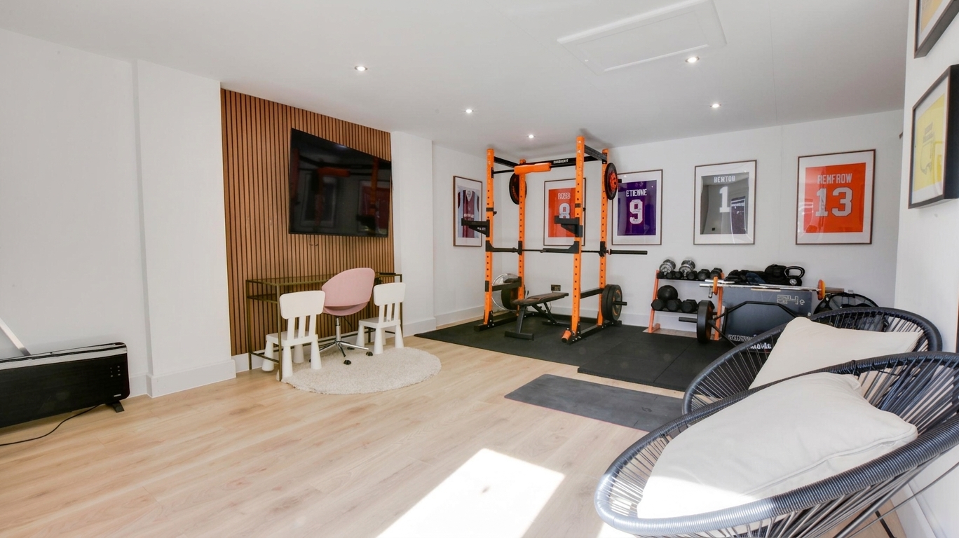 Converted double garage measuring 6.4m x 3.9m. Includes power, spotlights, and a loft hatch for extra storage. Accessible via patio doors from the rear garden or a garage door from the front.