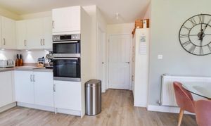 The kitchen diner spans the width of the property and is fitted with a range of wall and base units, alongside an oven, grill, gas hob, built-in dishwasher and fridge freezer. Patio doors provide direct access to the rear garden, and a separate utility room offers additional storage and appliance space, with a door to the side of the property.