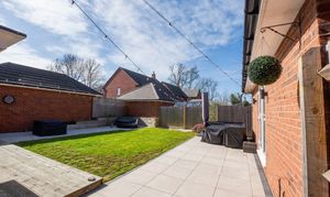 Externally, the rear garden includes a decking patio area, lawn, and low-maintenance borders, with a pathway leading to the garage. The driveway provides off-road parking for approximately four vehicles.