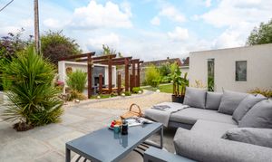 - South-facing landscaped garden with a sunken outdoor kitchen and seating area, ideal for entertaining