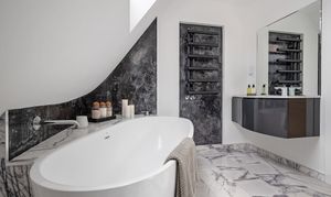 All of the three remaining bedrooms are generous doubles and beautifully presented. Bedroom two would be ideal for guests, complete with glass Juliet balcony and a built-in wardrobe, while bedroom three has copious walk-in storage too. These bedrooms share a really glamorous bathroom with underfloor heating beneath marble tiles, dreamy free-standing bathtub, walk-in shower and designer radiator.