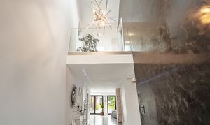 The double-height entrance hall makes a luminous first impression with its soaring black and white walls to the glass galleried landing, slanted ceiling and overhead skylight – it’s ‘industrial chic’ at its finest and is the gateway to the luxurious open-plan ground floor which features underfloor-heated micro-cement throughout and glamorous Venetian plaster décor details.
