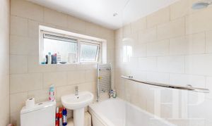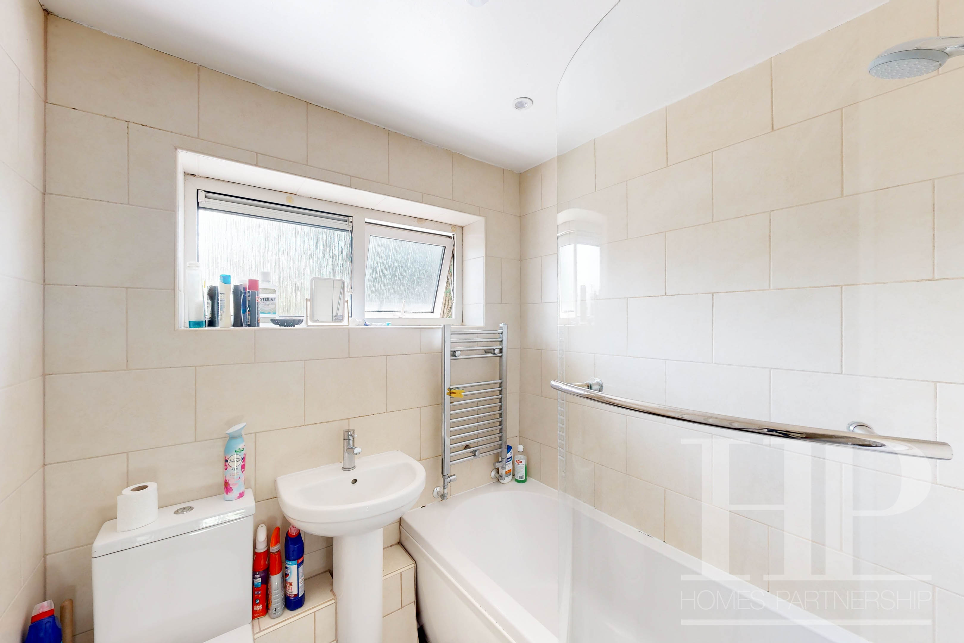 Shared bathroom (between 3 rooms) located in the adjacent room to the bedroom. White suite comprising a bath with shower over, pedestal wash hand basin and low level WC. Tiled flooring. Heated towel rail.