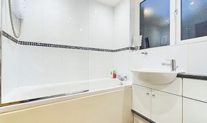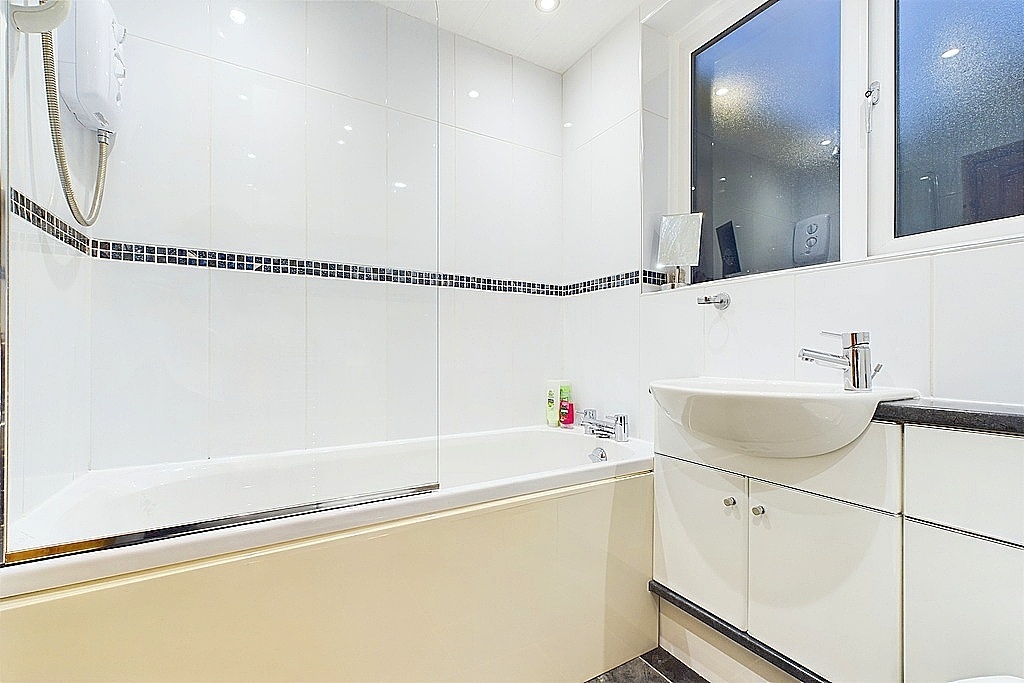 The stylish bathroom has a bath, with mixer tap, glass screen and electric shower above. The bathroom features a white vanity unit incorporating a hand wash basin, concealed cistern toilet and storage below. The room benefits from fully tiled walls, tile effect flooring, a chrome towel heating radiator, ceiling spotlights and a uPVC frosted glass window.