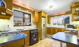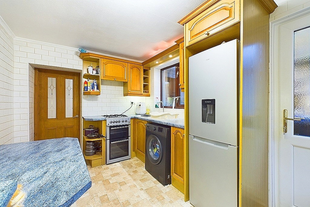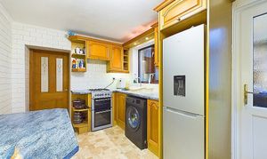 The kitchen benefits from fully tiled contemporary tiles and tile effect flooring. There is a range of wood wall and base units with contrasting worksurfaces, with pelmet lighting above the sink and under cupboard lighting. A cream sink and draining board with mixer tap is set below a uPVC double glazed window, overlooking the side of the property. A second uPVC double glazed window provides additional light. There is space and plumbing for a washing machine, and space for a freestanding fridge freezer and cooker. The kitchen features open shelving, a breakfast bar and a uPVC door leads out to the rear.