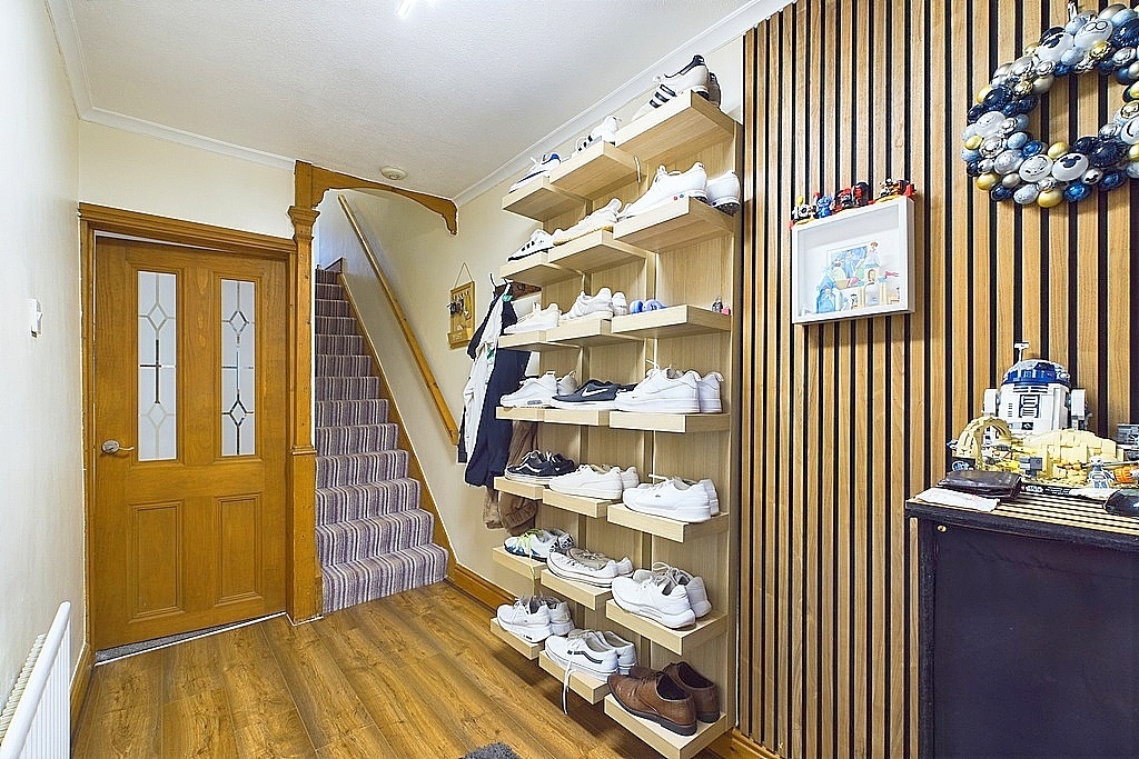Entered through a uPVC door, with frosted glass panel and top light, the spacious hall has plenty of space to house a shoe and coat rack. Stylishly decorated , the hallway has wood panelling to one wall creating quite a feature. There is decorative coving, wood effect flooring. The hallway benefits from a radiator and there is a door to the lounge and open stairs to the first floor.