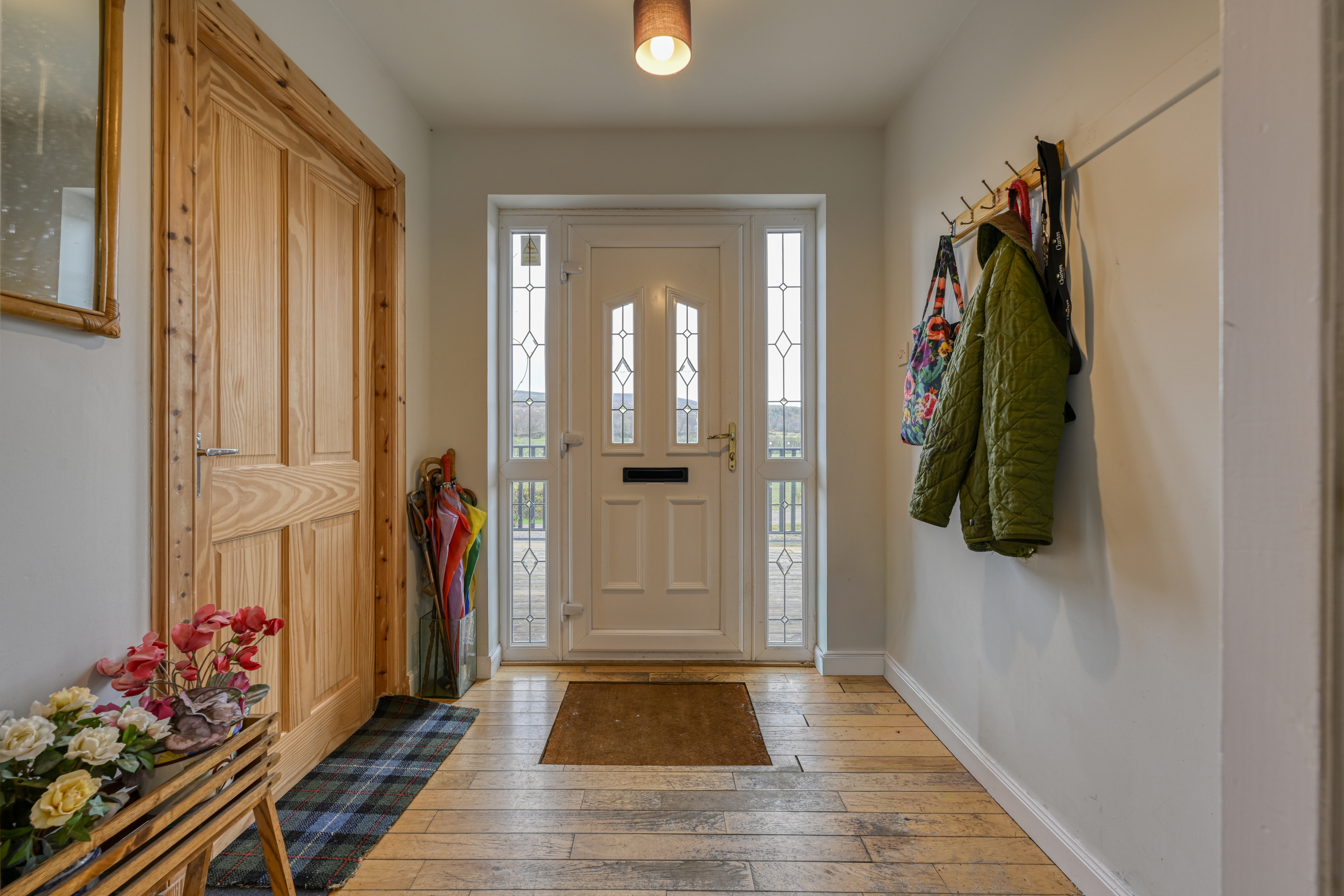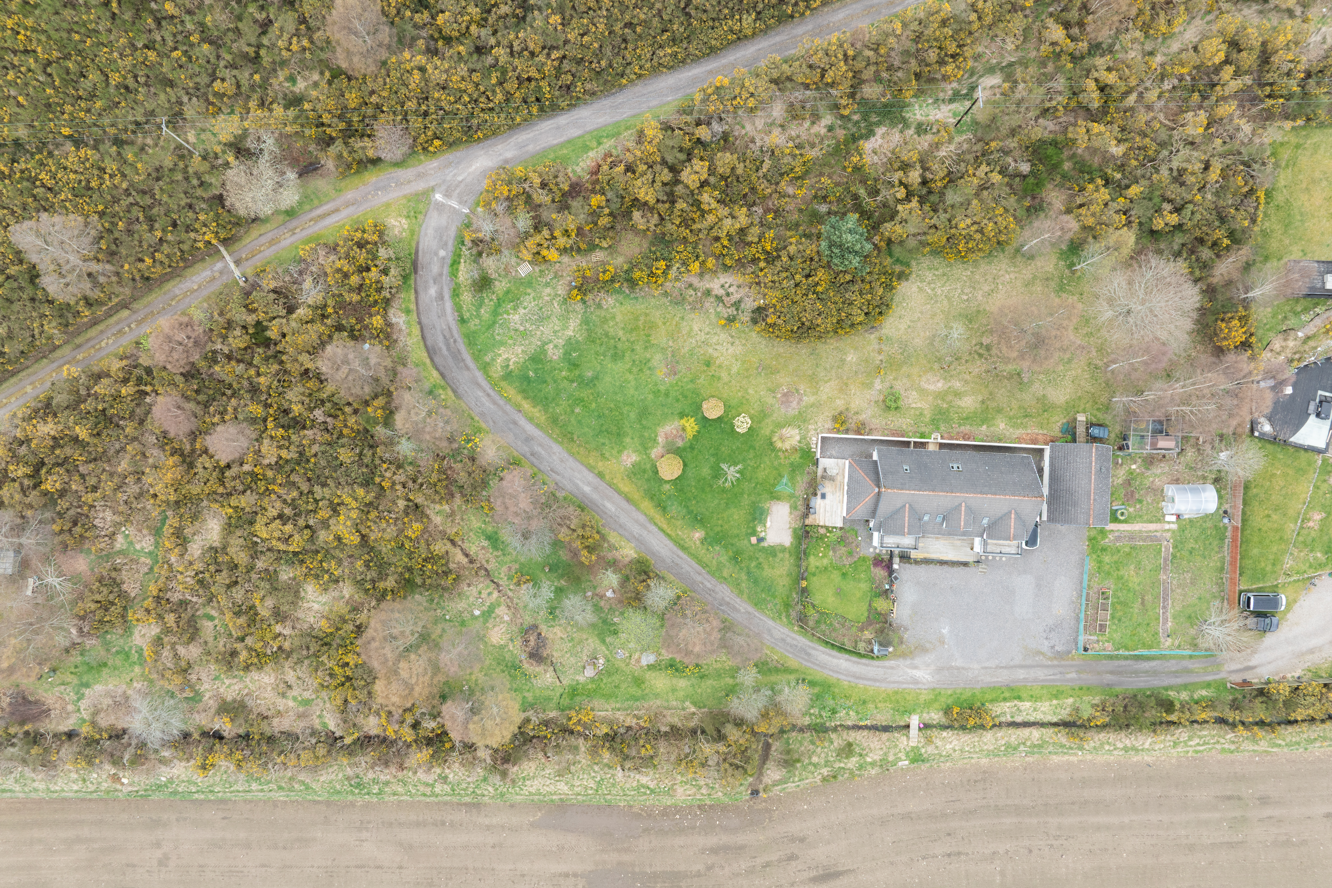 Rowanvale is approached by way of a privately owned access track, over which a neighbouring property has a right of access, leading to a gravelled parking area to the front of the house. The grounds extend to approximately 1.3 acres and are a particular feature of the property, comprising sweeping lawns, mature trees, established shrubs, stocked flowerbeds and a timber decked seating area. To the rear, the gardens slope gently and are laid mainly to grass, interspersed with mature trees and gorse bushes. To the east lies a former vegetable garden with raised beds, a polytunnel and chicken run, while on the opposite side of the access track there is a further grassed area fringed with mature trees, underplanted with spring flowering bulbs and incorporating the remains of a pond. A substantial detached double garage, with power, lighting, up-and-over door and useful storage, completes the property.