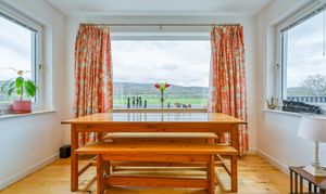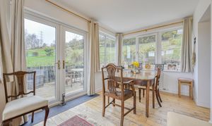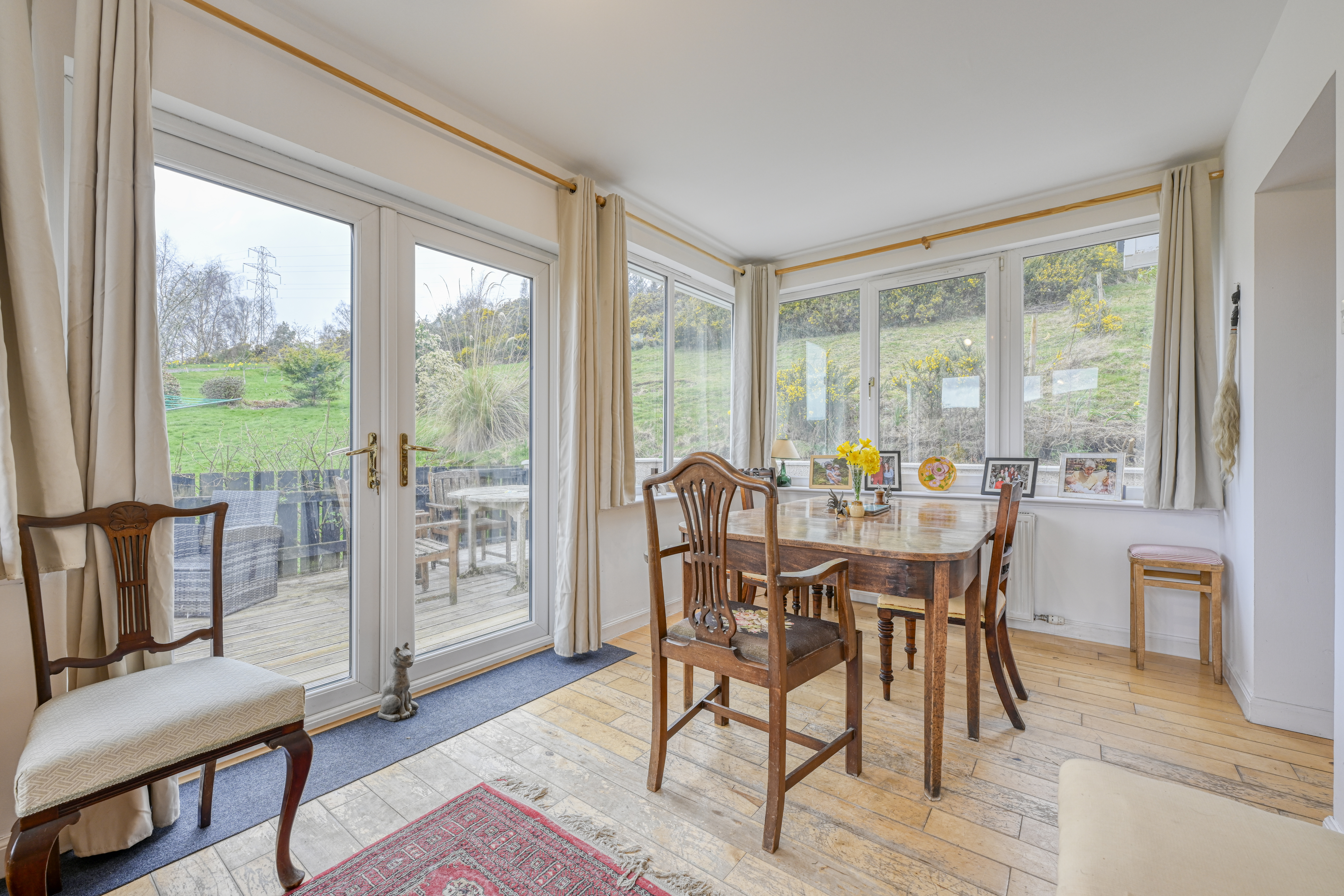 - Bright dining room with picture windows and French doors to the garden