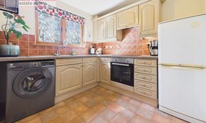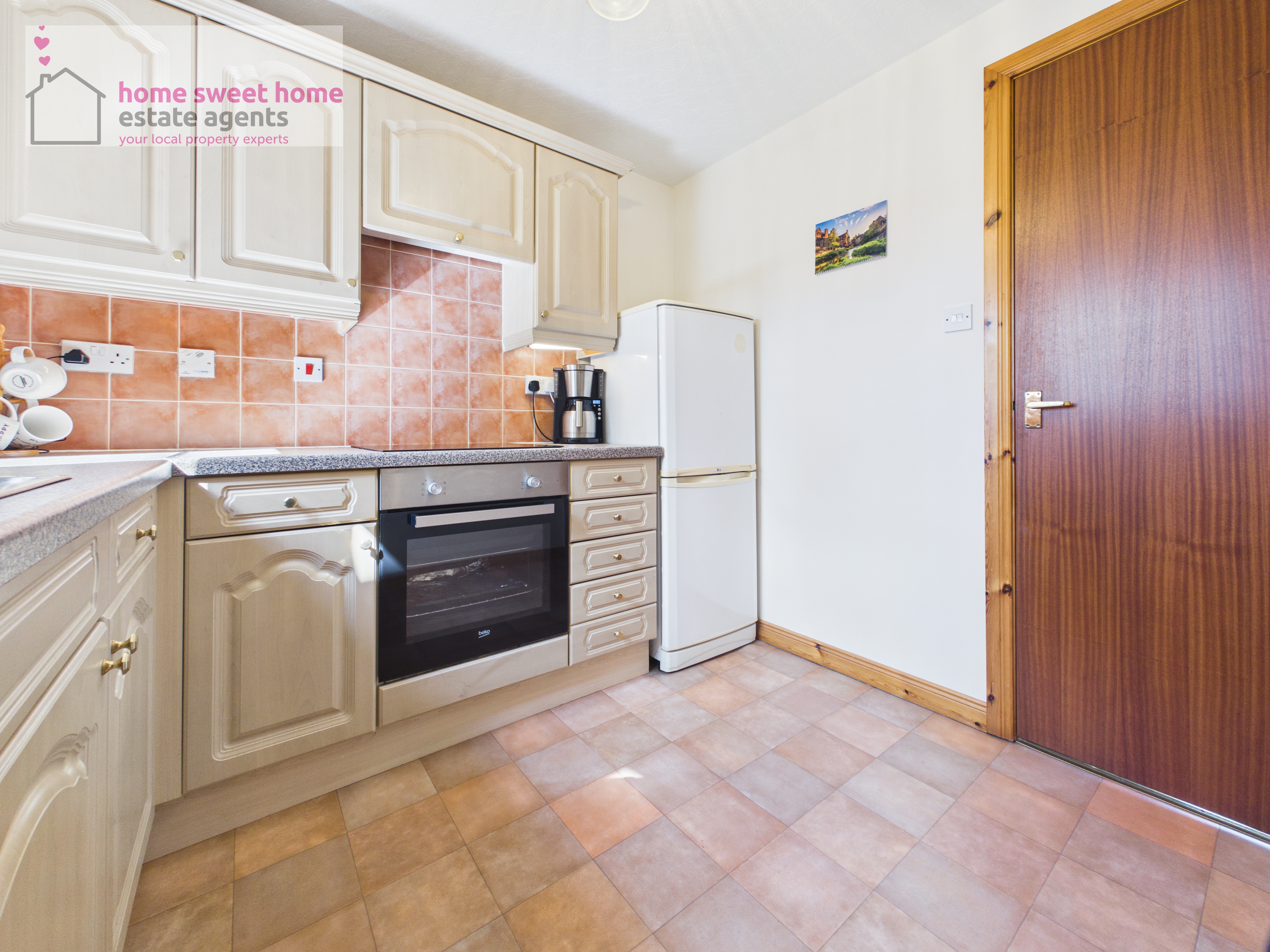 The accommodation is bright and well laid out, comprising a welcoming entrance hallway leading to a generous lounge, providing an ideal space for both relaxing and entertaining. The fitted kitchen is well-appointed with ample storage and workspace, making it practical for everyday living. There are two spacious double bedrooms, both offering excellent proportions and flexibility for use as bedrooms, guest accommodation, or home working space if required.