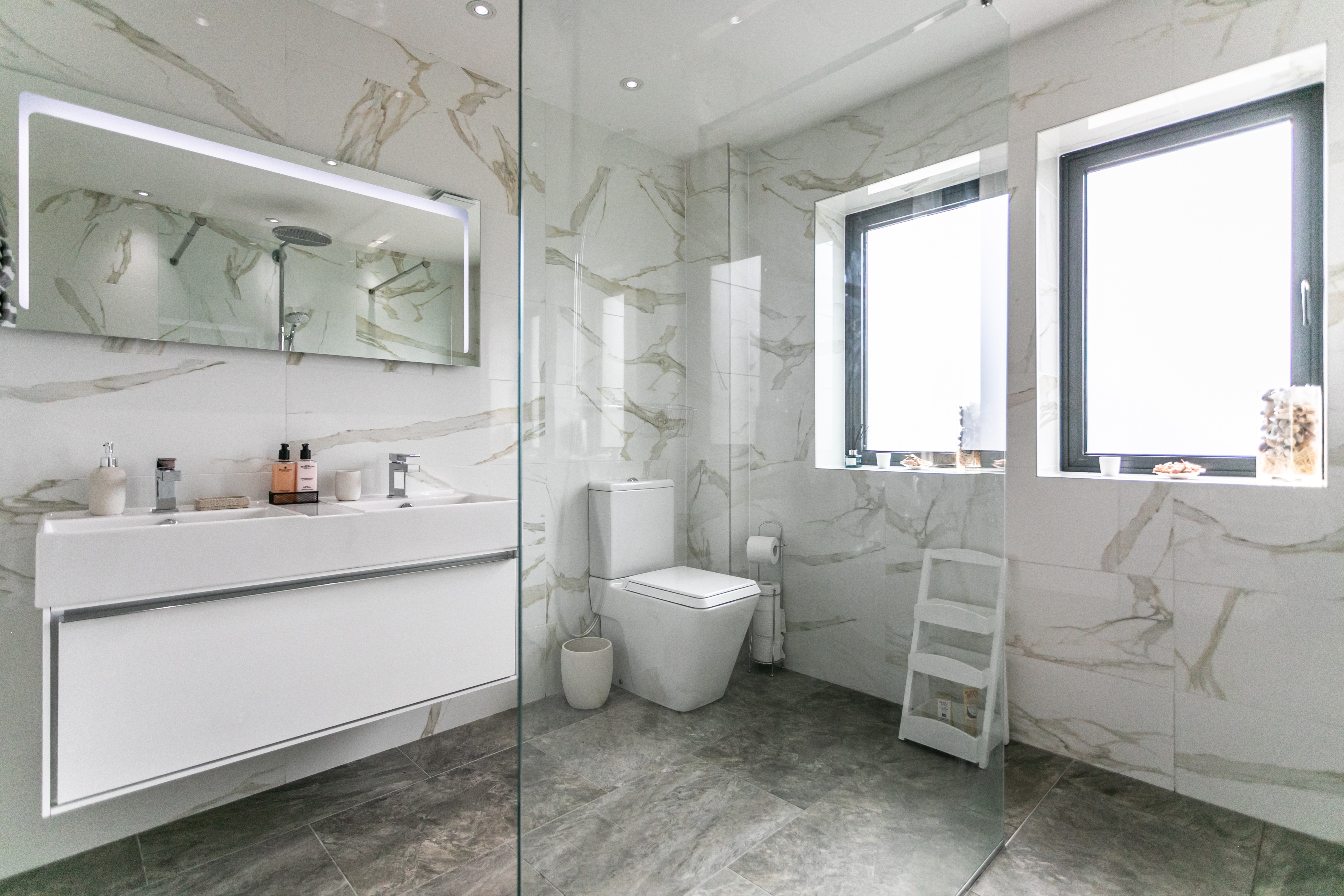 Heading up the exquisite, subtly lit spiral staircase, designed to offer soft, atmospheric lighting from the inside out - you’re welcomed onto a generous landing. From here, you’ll find four well-proportioned double bedrooms, a spacious family bathroom, and access to a boarded loft space. Each bathroom has been thoughtfully designed, complete with large walk-in shower enclosures, high-performance Grohe showers, sleek Porcelanosa fittings, LED-lit mirrors, and white porcelain tiled walls. Underfloor heating throughout keeps everything at a consistently comfortable temperature. Lighting has been meticulously considered throughout the home, with lighting designers consulted to ensure every room enjoys the perfect balance of natural light and ambient illumination. Of the bedrooms, room two benefits from its own en-suite and enjoys peaceful, pastoral views. Bedroom four is another comfortable double, while the guest room feels especially inviting with its striking feature window overlooking the leafy frontage.