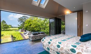 The master bedroom is everything one could wish for, with a Juliet balcony that almost steals the scene, opening to the rear and offering serene views over open countryside. From here, the outlook stretches across misty fields where mornings begin with coffee and evenings end watching the sun sink below the hills, accompanied only by birdsong. Velux windows in the vaulted ceiling flood the room with natural light, while solar-powered blinds ensure a restful night’s sleep. Inside, a large, bright en-suite and made-to-measure wardrobes on either side provide practical luxury, complemented by smart lighting and heating for comfort. Wildlife thrives in this timeless countryside setting, with barn owls and woodpeckers adding an enchanting sense of calm to everyday life.