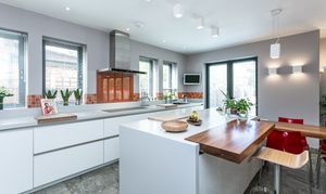 - Sleek, modern kitchen with a large island and breakfast bar