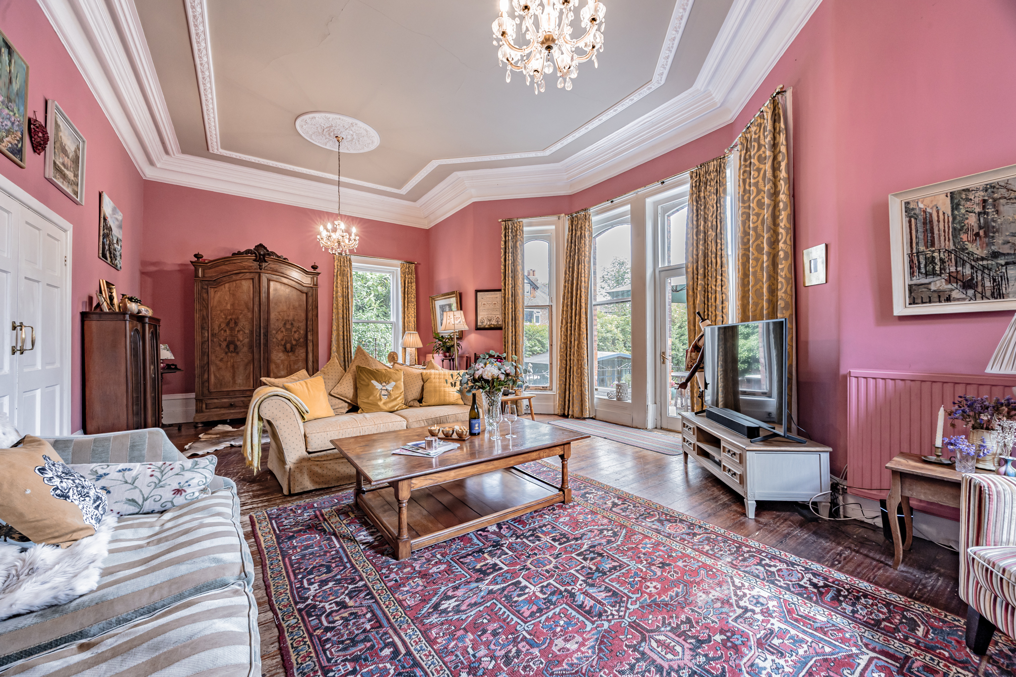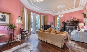 To the left, the impressive ballroom-style lounge provides a superb space for entertaining or family life, with period fireplaces, sash windows, French doors to the garden, and a lovely sense of light and space.