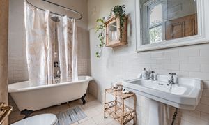 Upstairs, the generous landing is flooded with light from a striking stained-glass window. There are four bedrooms in total, including a guest bedroom with ensuite shower, and an elegant principal bedroom with dual-aspect views across the gardens and brook, complete with a characterful window seat. The family bathroom is currently fitted with a freestanding bath.