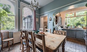 The kitchen, filled with natural light and complete with an open fire and dual-aspect garden views, offers ample room for dining and could be reconfigured into a stunning contemporary-meets-period space. A large, versatile cellar with three chambers lies beneath, brimming with potential for further development — ideal as a wine cellar, gym, or additional storage.