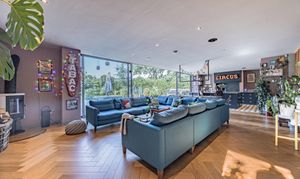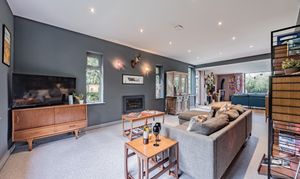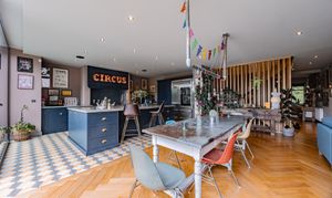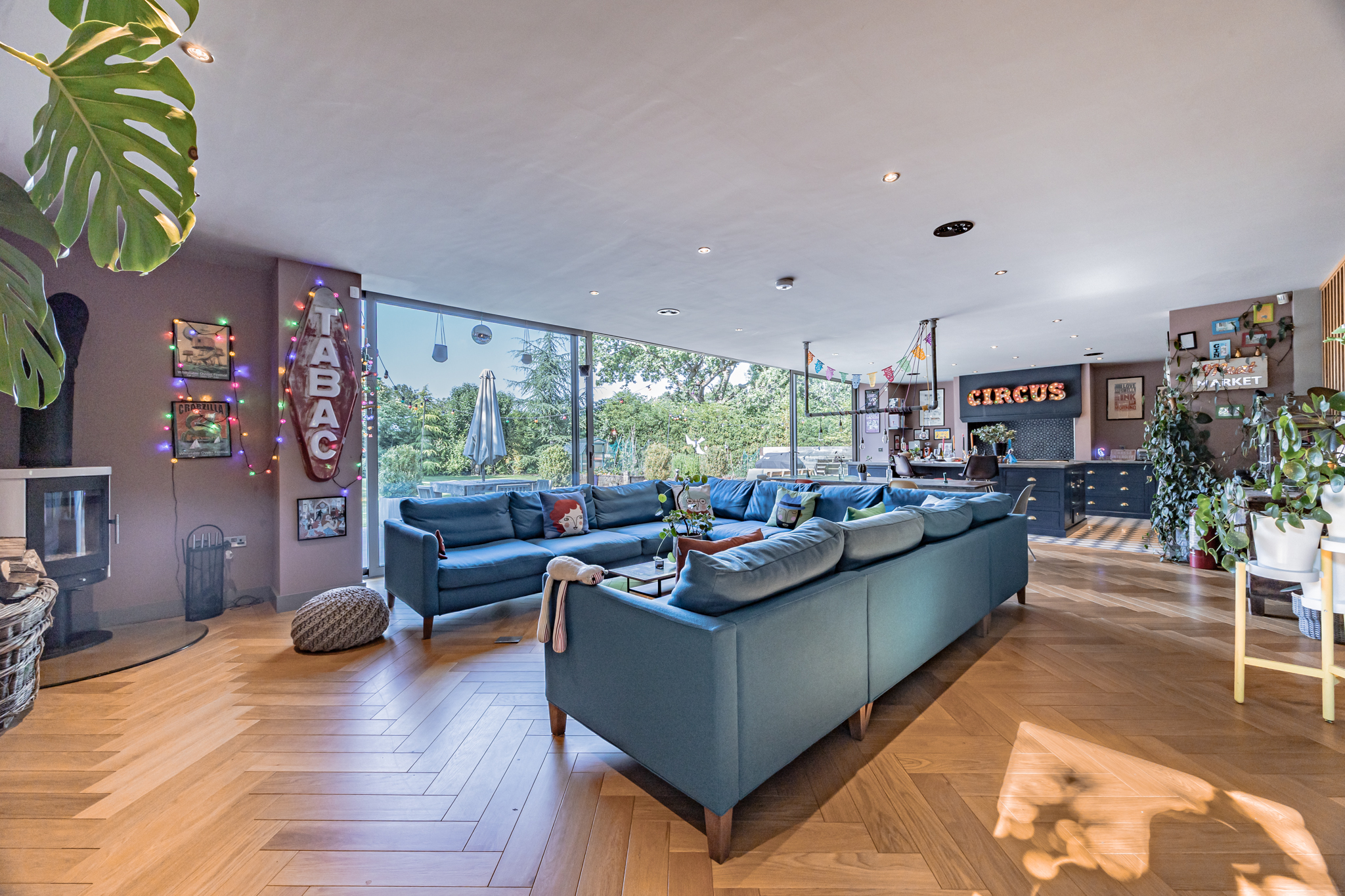 - Stunning Open-Plan Living Kitchen, featuring parquet-style solid oak herringbone flooring, bespoke cabinetry, polished concrete worktops, and ten-metre sliding doors.