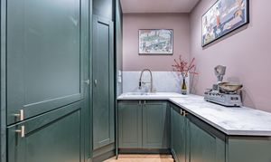 A standout feature of this home is the stunning open-plan living kitchen, with parquet-style solid oak herringbone flooring, bespoke solid oak cabinetry, polished concrete worktops, a large central island, log burner, underfloor heating, and ten-metre sliding doors that seamlessly connect to the impressive rear garden through a five meter opening. Enhancing the luxury feel, features such as a built-in sound system on the ground floor, a high-end Sub-Zero fridge/freezer and a Wolf dual fuel range oven which features an chargrill indoor bbq, griddle and 6 gas rings, and 2 double ovens, all available by separate negotiation. Designed with the culinary enthusiast in mind, the kitchen boasts top-of-the-line appliances and luxurious finishes- a true haven for any chef.