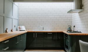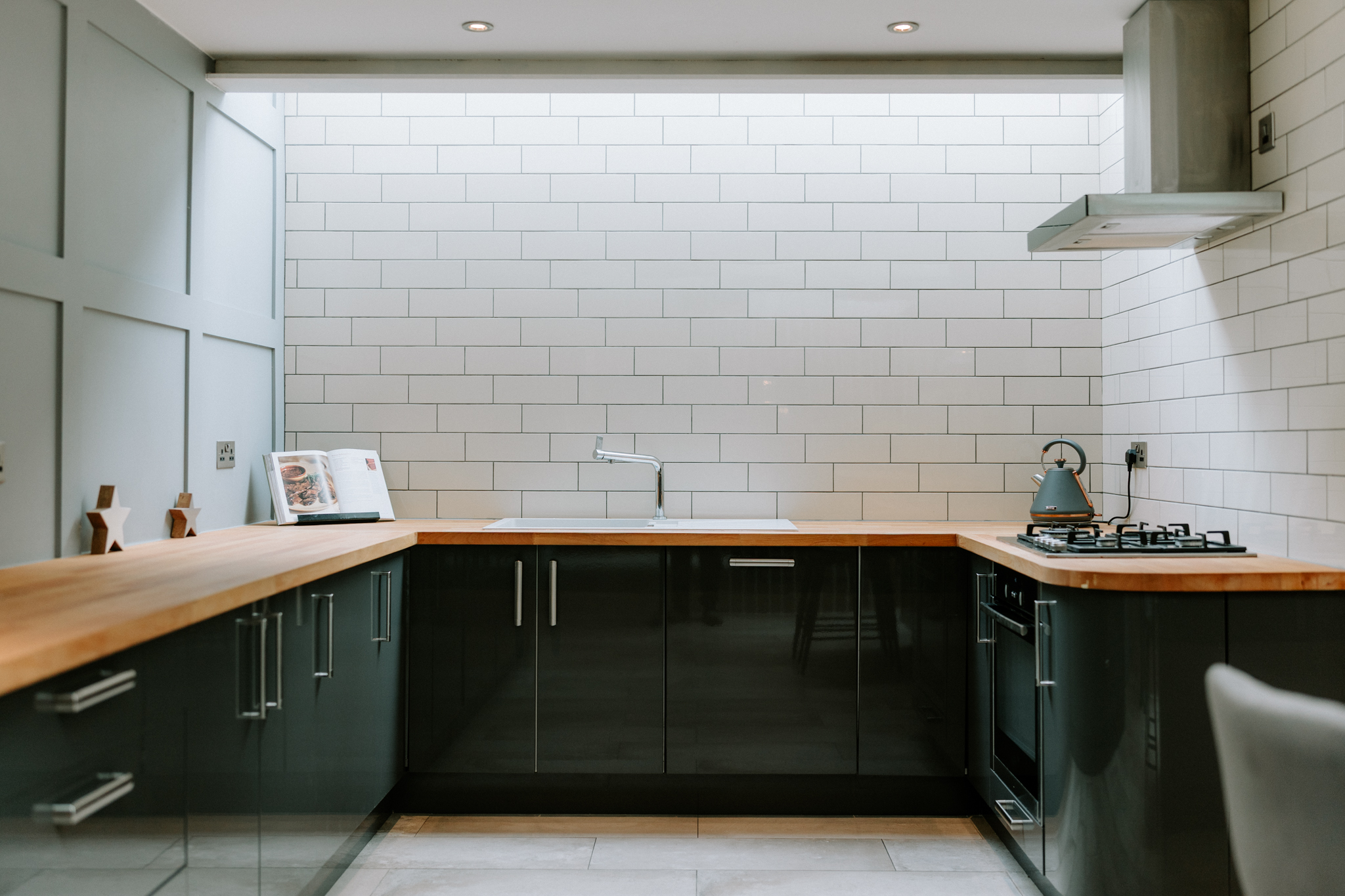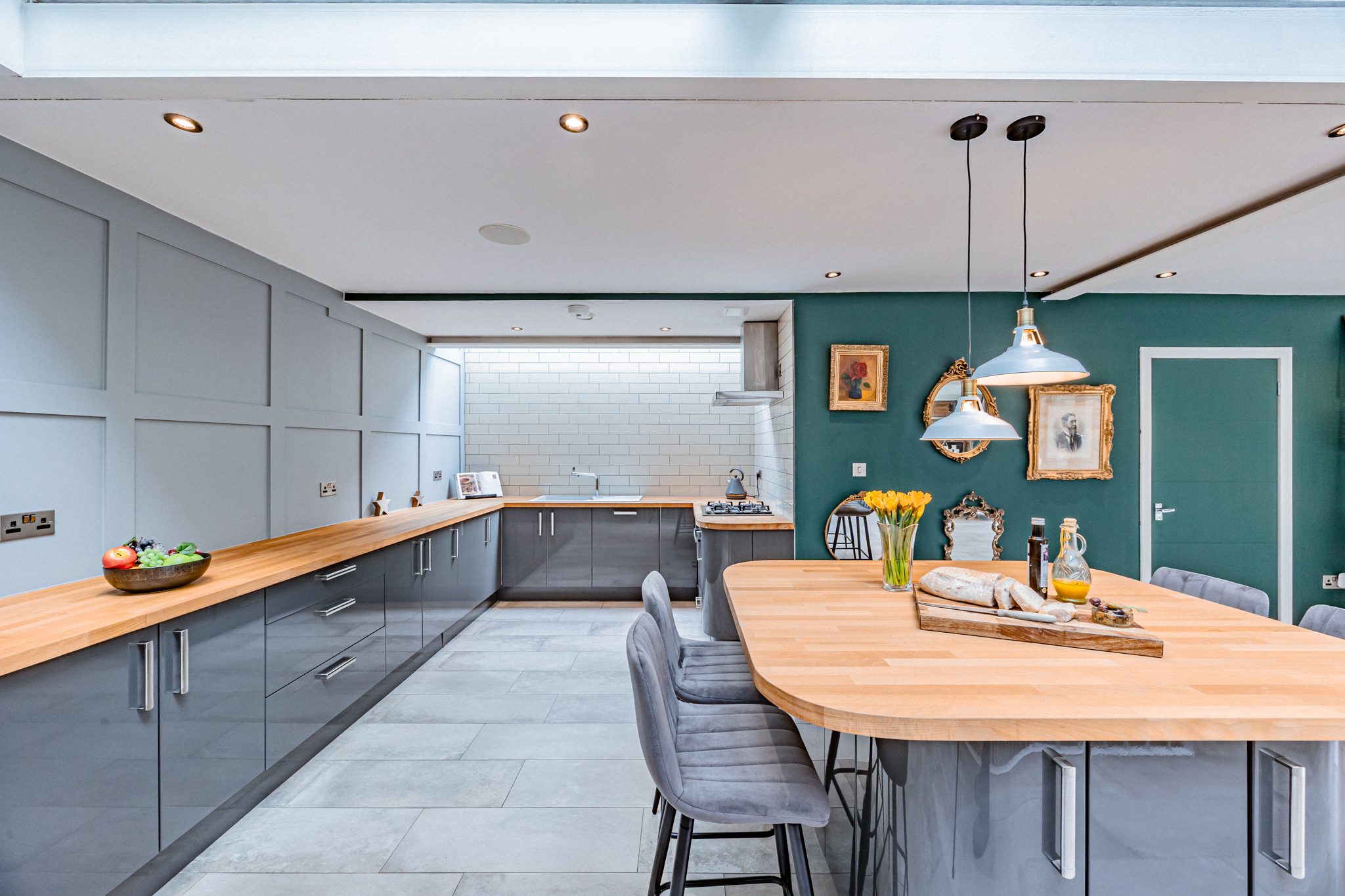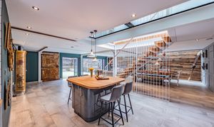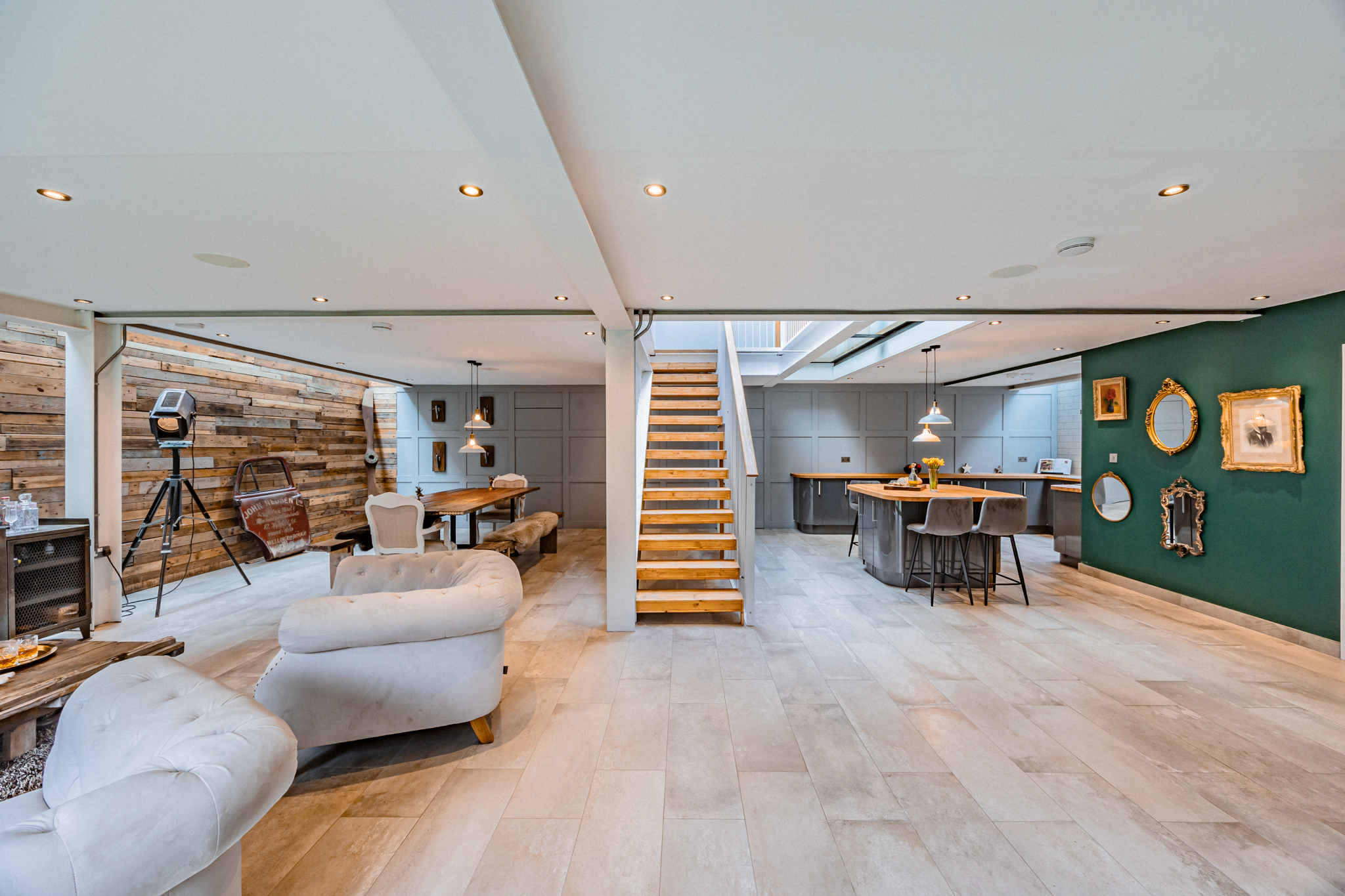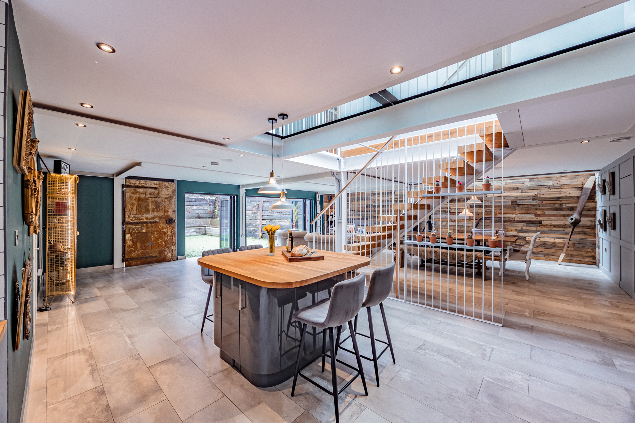 The heart of the home is a striking open-plan living, dining, and kitchen area, perfectly designed for modern family life and entertaining. Industrial-style elements provide character and edge, while bi-folding doors extend the space seamlessly into the garden, creating a light-filled, indoor-outdoor living experience. The bespoke kitchen is both stylish and practical, featuring high-gloss base units, warm wooden worktops, a central island, a 4-ring gas hob, and integrated appliances, complemented by a utility room offering additional storage and workspace.