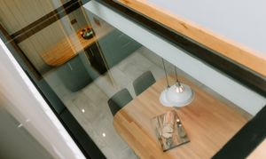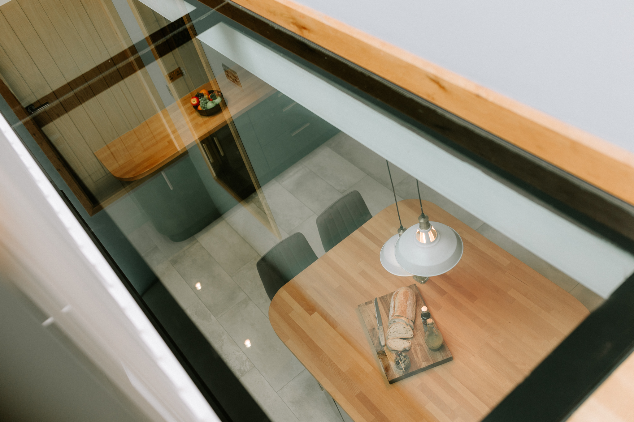 The moment you enter, a dramatic sky lantern hallway floods the space with natural light, highlighting a striking glass walkover that elegantly bridges the staircase to the kitchen below. This unique architectural feature creates an airy, visually captivating connection between floors, setting the tone for the home’s contemporary design.