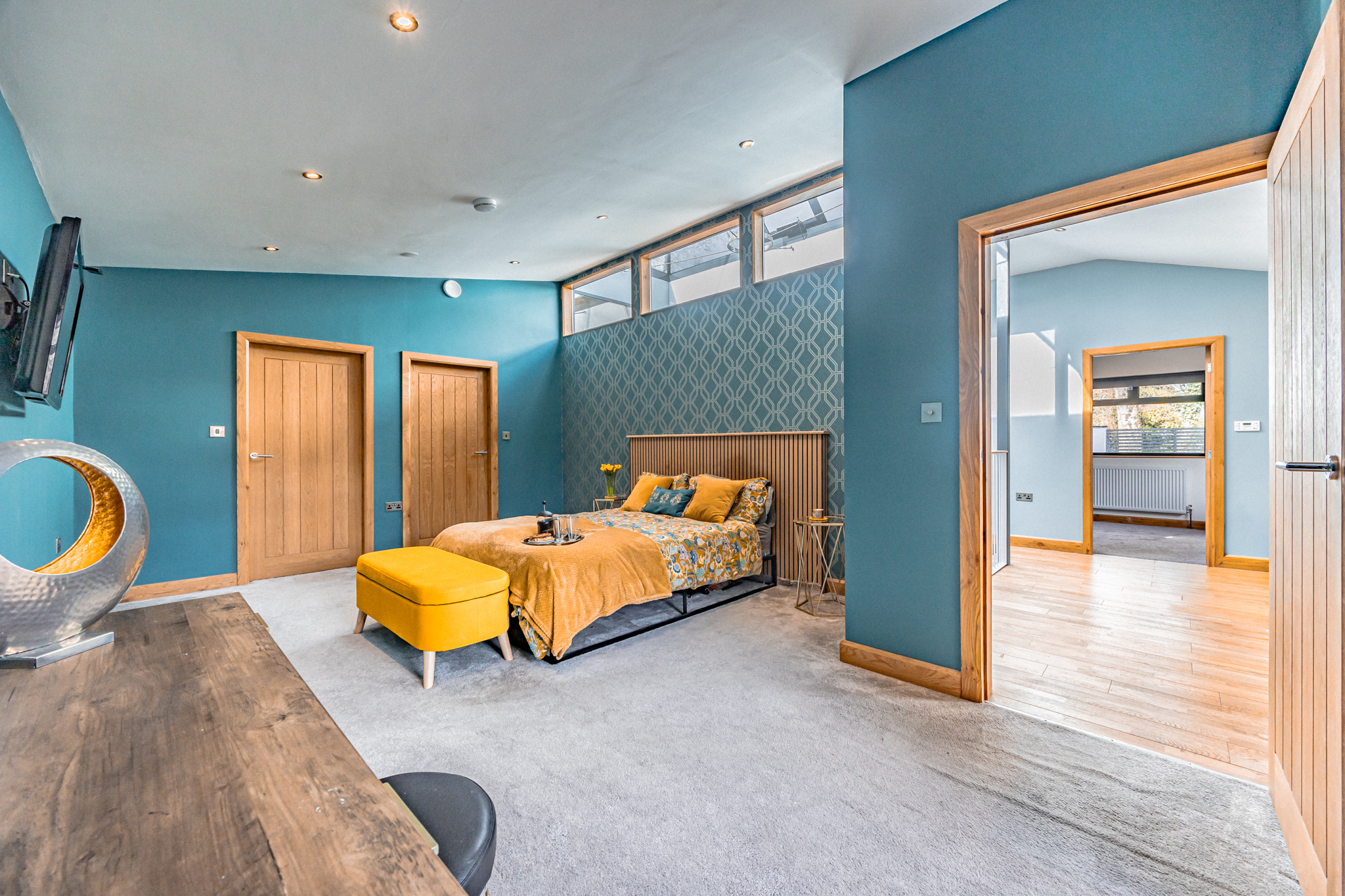 The master suite, accessed directly from the hallway, is a private sanctuary, offering a luxurious ensuite shower, a vanity sink, and expansive walk-in wardrobes. Two additional double bedrooms provide flexible accommodation: one benefits from dual-aspect windows that maximize daylight, while the other is pre-wired with Cat 5 cabling to support high-speed connectivity, ideal for remote working or gaming. A beautifully appointed family bathroom features patterned tiled flooring, a freestanding bath, a separate shower, a vanity sink, and a touch-sensitive mirror, while a cleverly designed Jack and Jill shower room adds both convenience and privacy for the family or visiting guests.