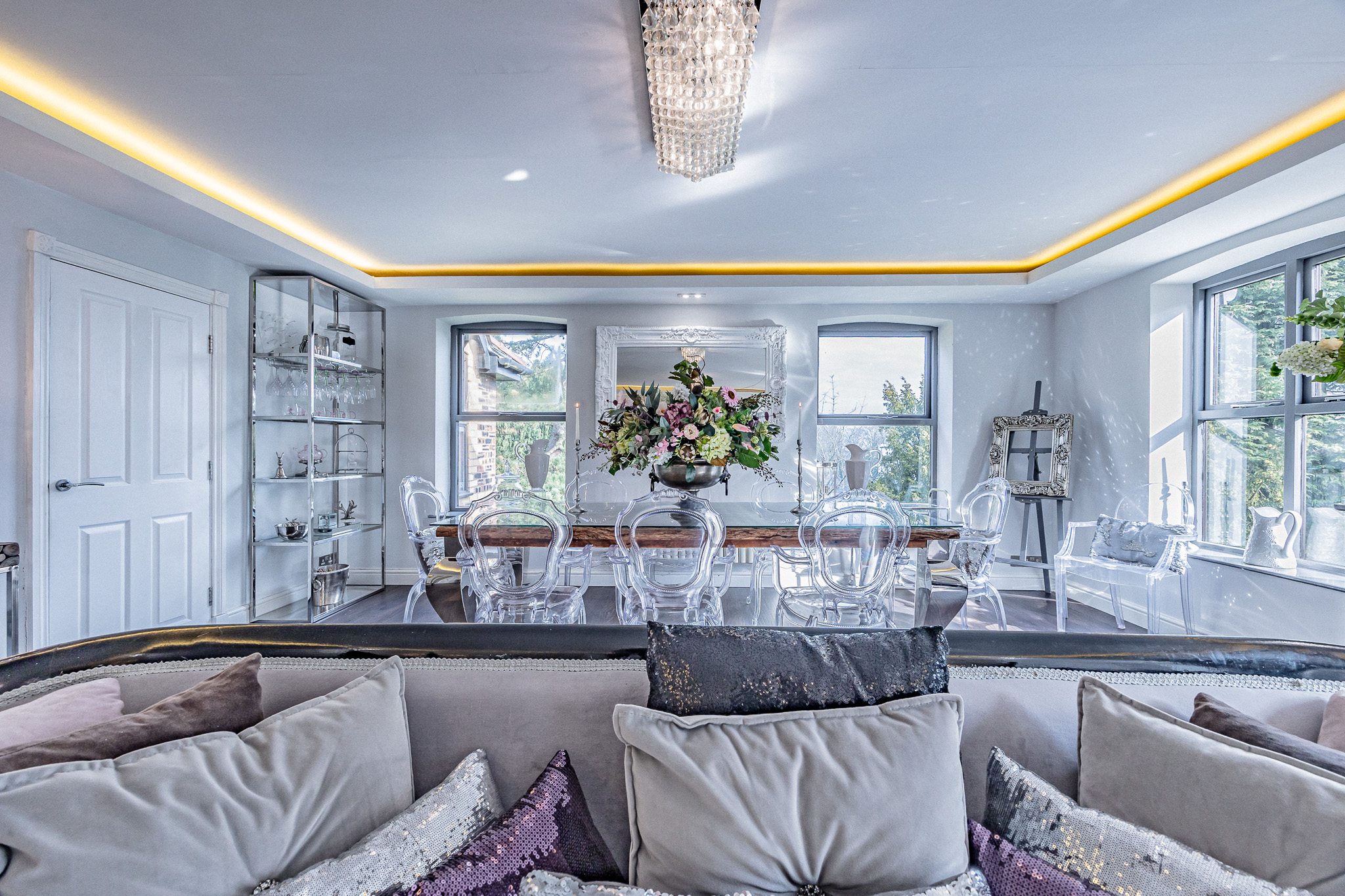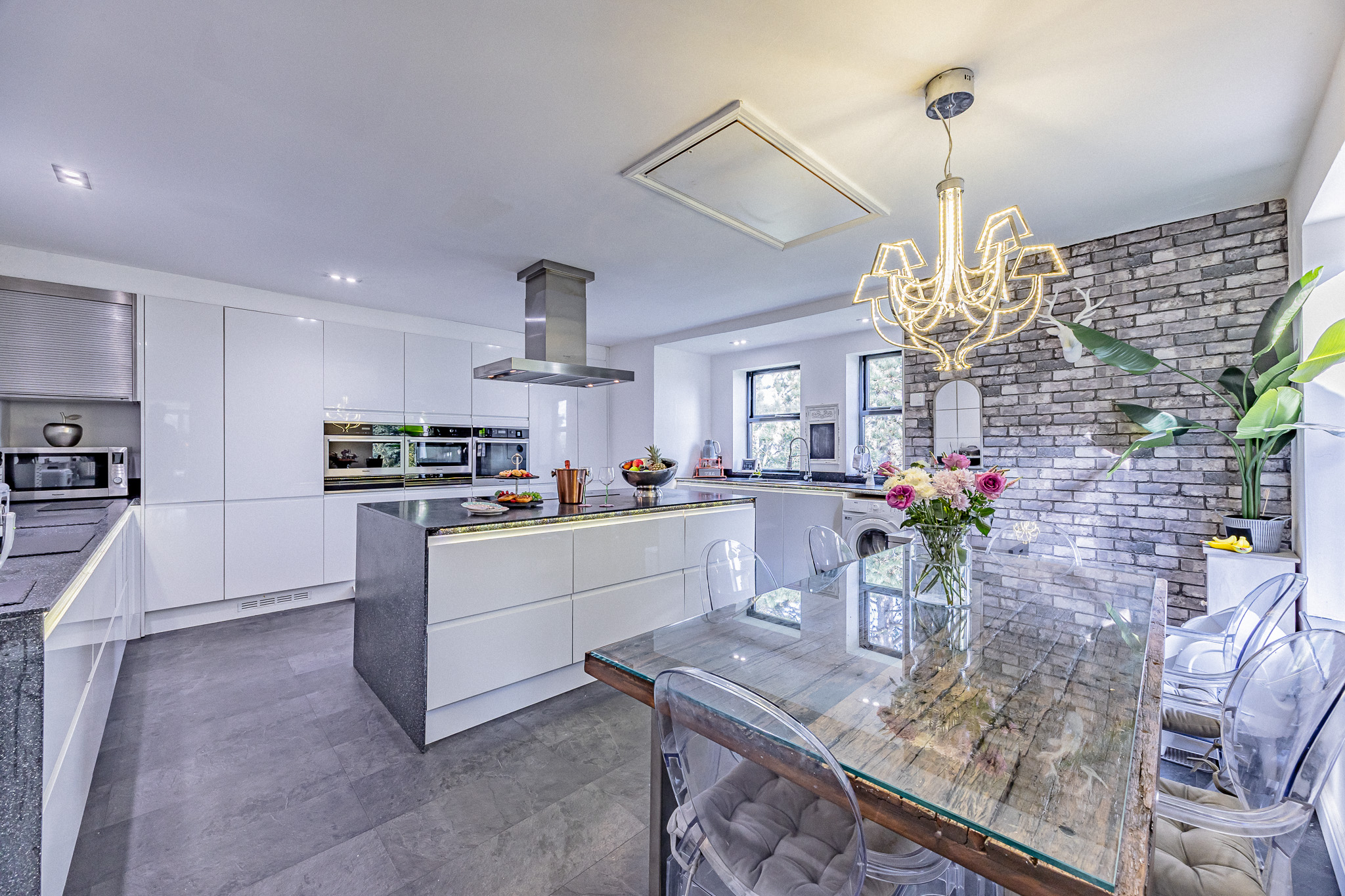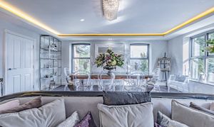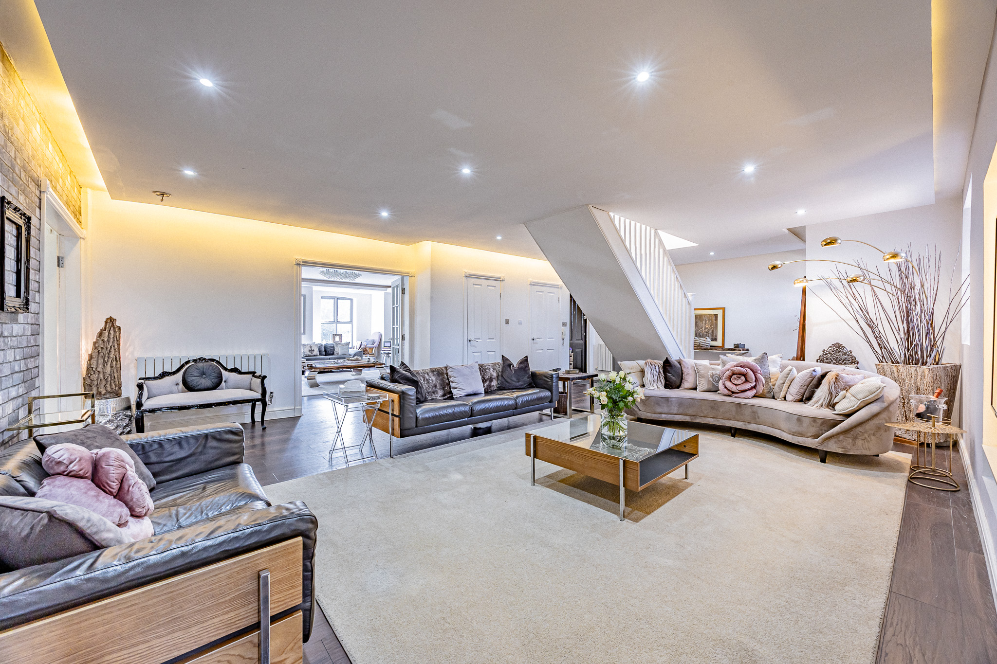 A sitting room sits comfortably beneath the stairs, offering space for a wall mounted television with ambient lighting and a cosy yet elegant atmosphere. Double glass doors open seamlessly into the heart of the home, leading into the spacious living and dining area which is beautifully private, dual aspect and not overlooked, creating a peaceful environment surrounded by mature greenery. Windows wrap around the space allowing natural light to flood in and providing room for a large dining table comfortably seating eight, making it perfect for entertaining. Adjacent to this is the impressive breakfast kitchen which has been finished with tiled flooring and fitted with high quality integrated appliances including a Miele microwave, oven and steam oven, integrated full fridge and full freezer, an induction hob set within the island with a moveable extractor hood, a full size dishwasher, integrated bin storage and spice racks, space for a washing machine and a boiler that was replaced one year ago. The kitchen is thoughtfully designed with ample storage and a central island that creates a social hub for cooking and gathering. Off the seating area there is a large storage cupboard which offers fantastic versatility and could easily be converted into a utility space with shelving and room for additional appliances.