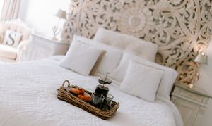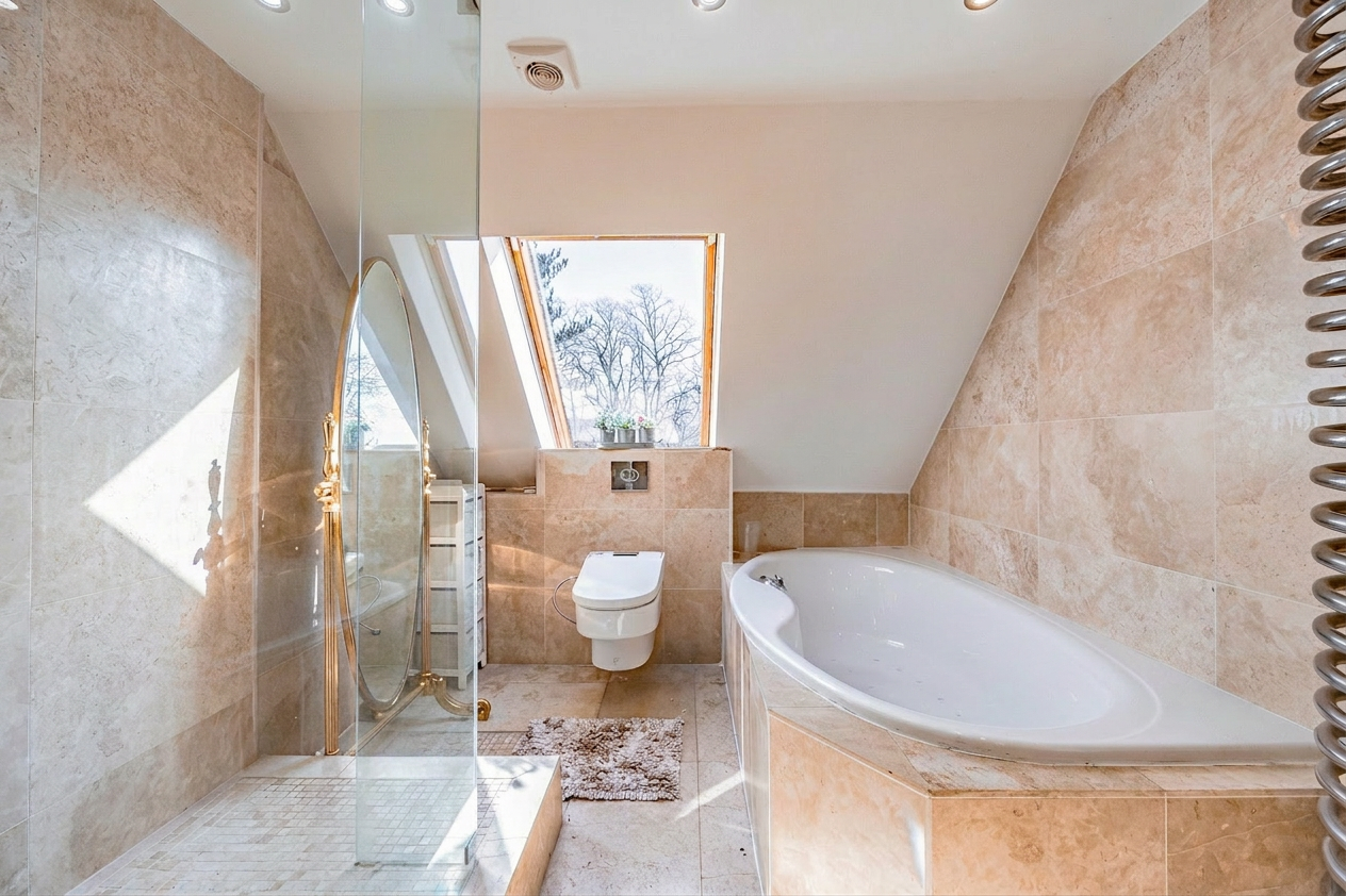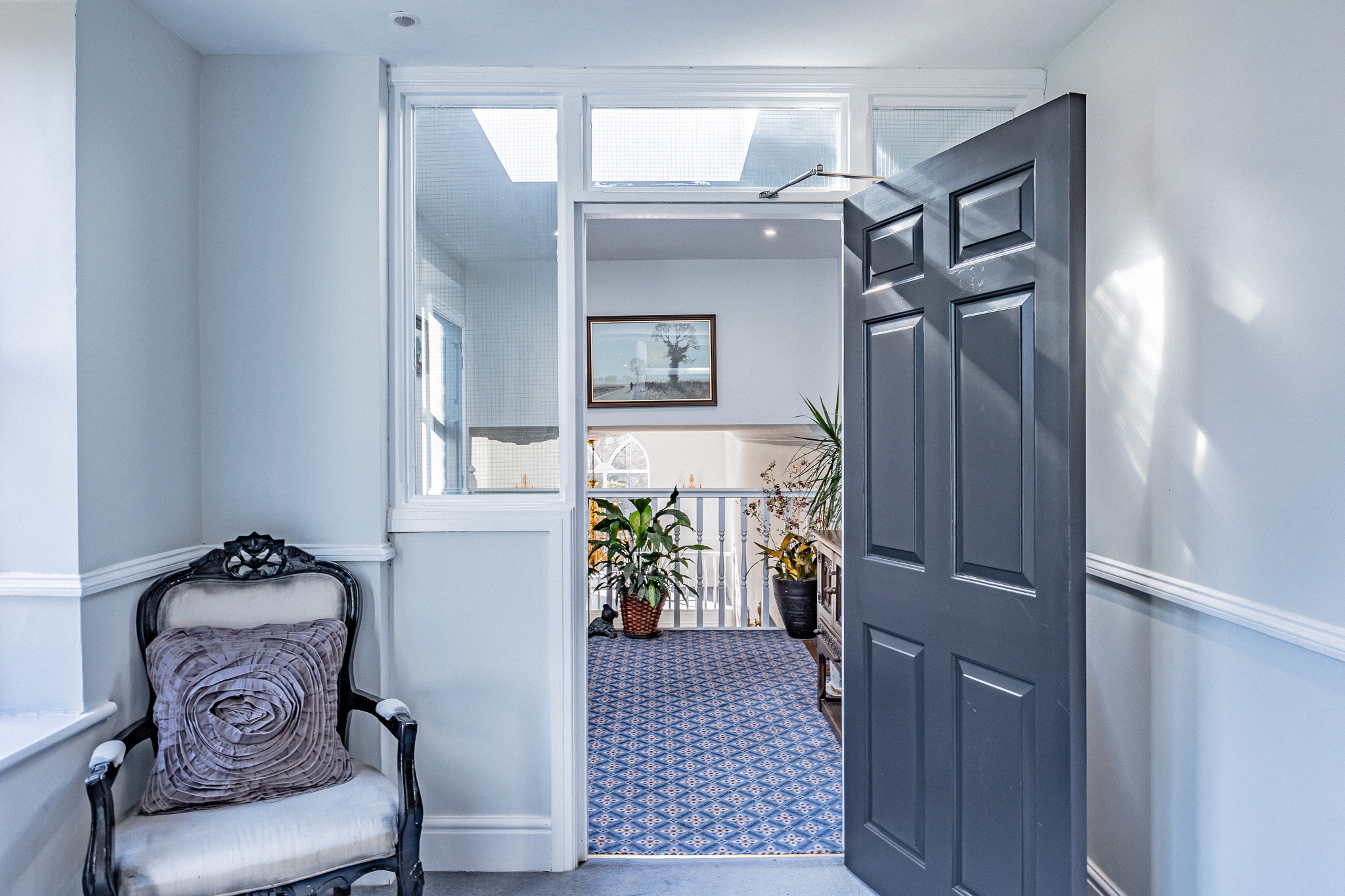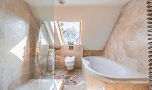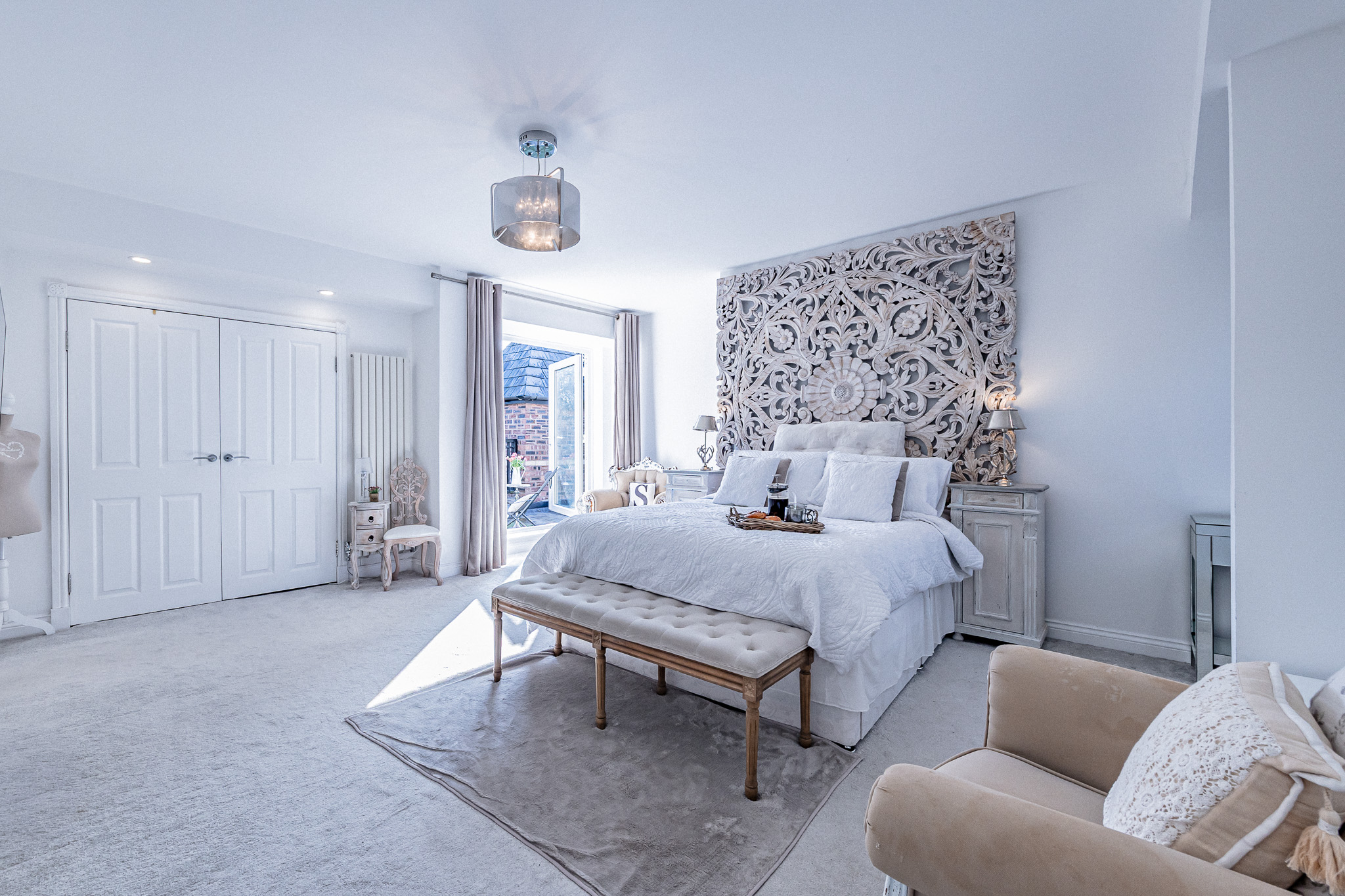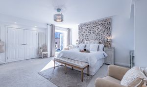 The bedroom accommodation is generous and well appointed. Bedroom two features a superb walk in wardrobe accessed through double doors, dual aspect windows, plush carpet and space for a super king bed along with seating or a desk area. On the upper level, bedroom one, the principle suite, is accessed to the right and benefits from French doors leading onto a balcony with additional storage positioned behind the bedroom door. It boasts an incredible double door walk in wardrobe that curves under the eaves, illuminated by a skylight and offering extensive fitted storage with standing space, creating a truly impressive dressing area. The ensuite bathroom is luxurious with a large skylight, a spa bath positioned to enjoy views of the trees and sky, a separate shower with both rain head and hand held fittings and a spiral radiator, forming a relaxing spa like retreat. Bedroom three is also a well-proportioned double bedroom with standing storage extending deep into the eaves maximising space throughout, and it includes its own ensuite featuring a rain head shower and skylight alongside further storage.