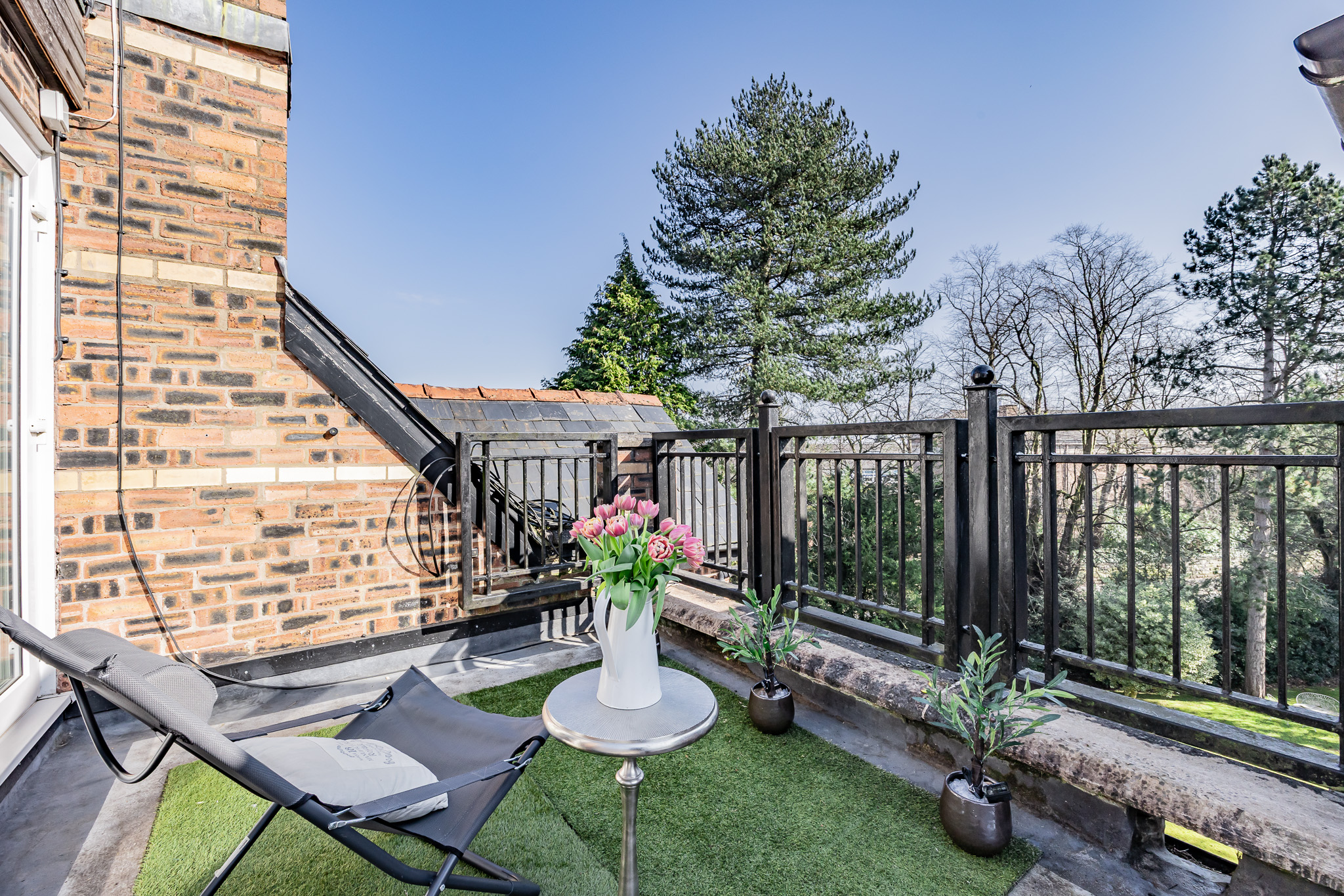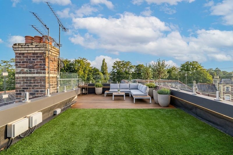 Access from the upper level leads to the roof where the spacious roof garden is one of the standout features of the property, finished with glass balustrades, raised planters, artificial grass, lighting and power points, and enjoying incredible panoramic views as it sits at the highest point in Altrincham. It provides a perfect setting for outdoor dining, entertaining or simply relaxing while taking in the surrounding skyline in complete privacy. In addition, there is a sun terrace accessed from the principle bedroom offering a further private outdoor retreat.